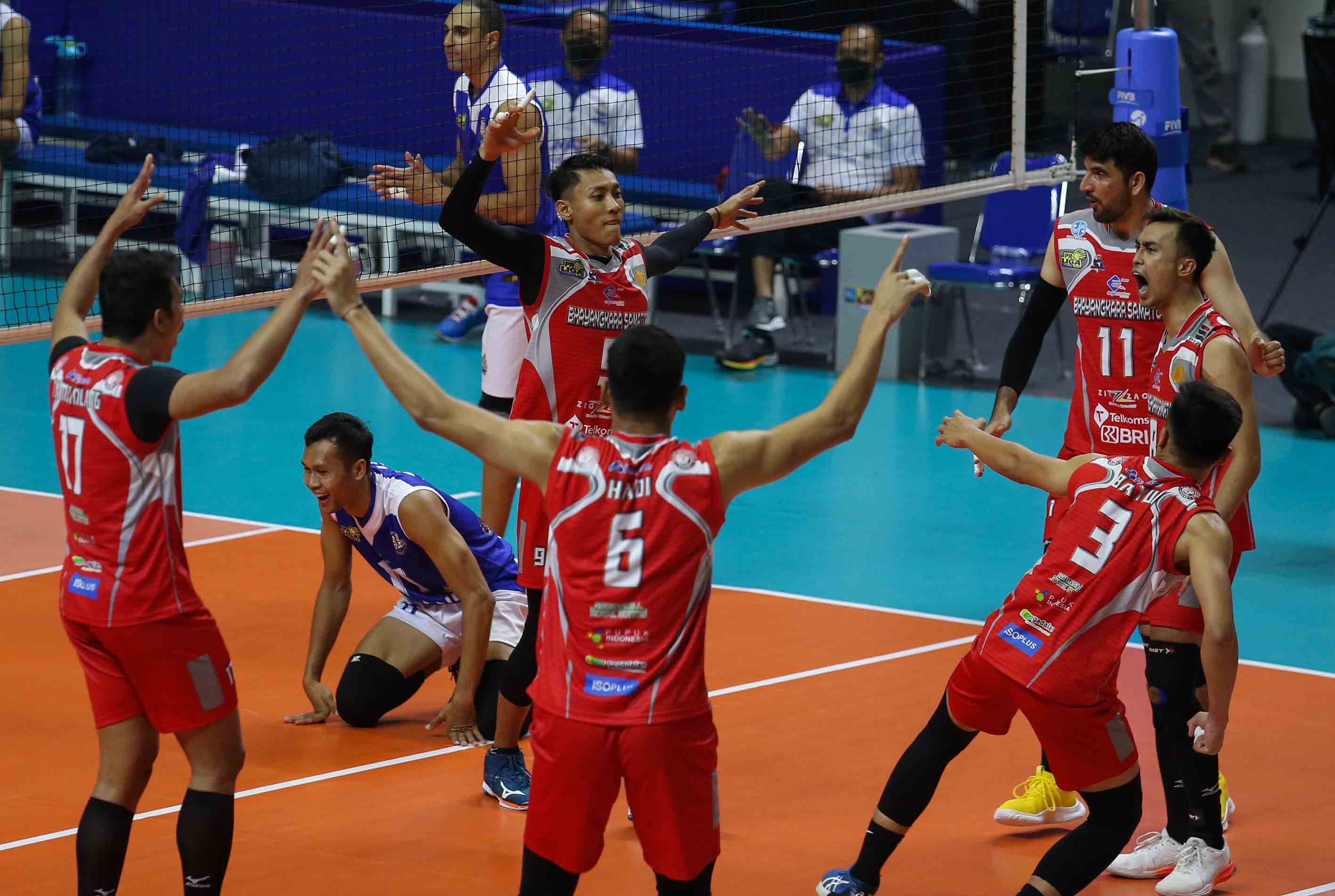 Pemain bola voli putra Surabaya Bayangkara Samator meluapkan emosi kegembiraan setelah berhasil meraih poin. Surabaya Bayangkara Samator harus mengakui keunggulan dari tim bola voli putra Bogor Lavani dengan skor 1-3 (15-25, 26-28, 25-23, 25-27) pada Pertandingan Proliga 2022 putaran kedua yang berlangsung di GOR Padepokan Voli Jenderal Polisi Kunarto, Sentul, Jumat (18/2/2022). (Foto : Erly Bahtiar/Sportsmoment.id)