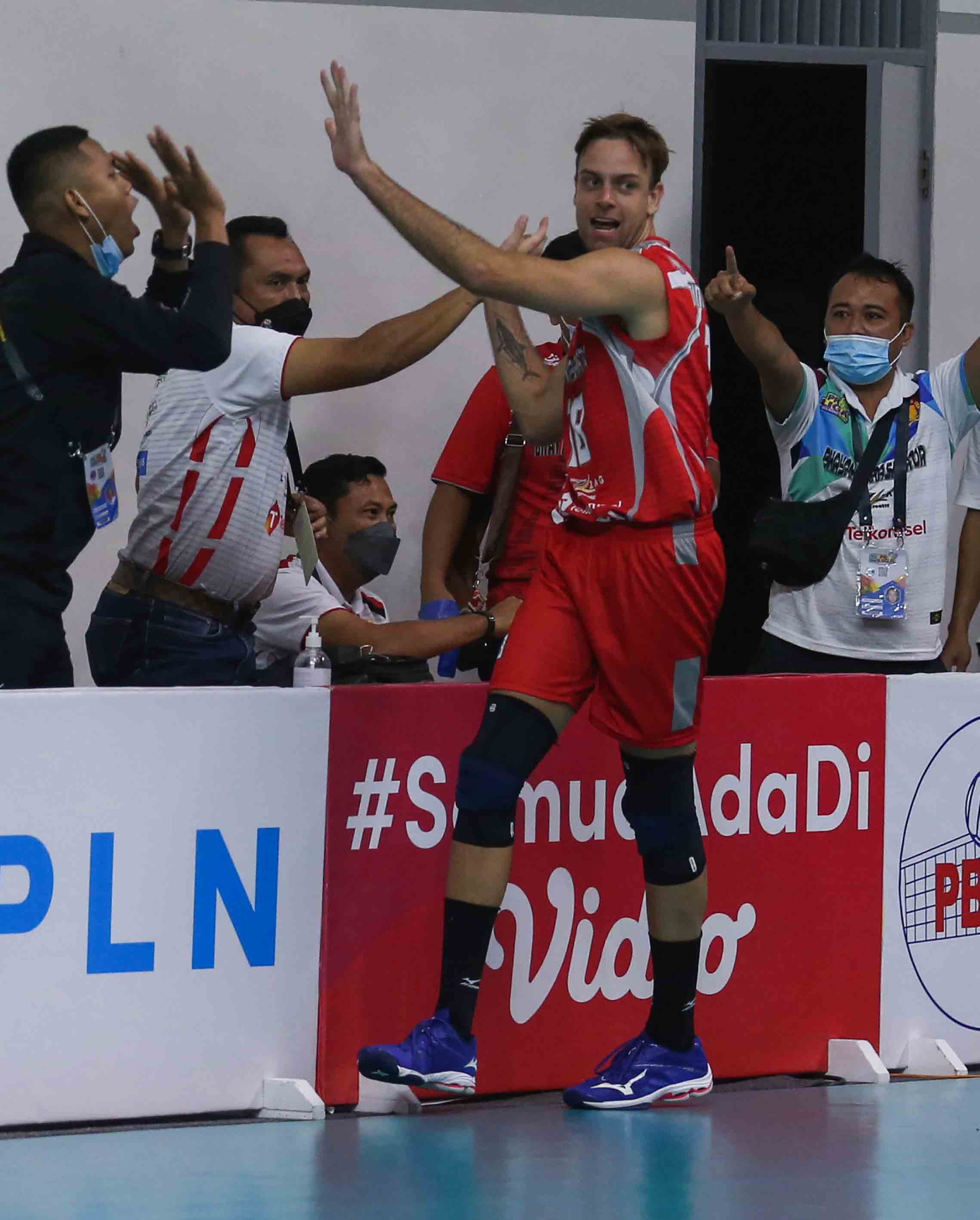 Tim Robert Taylor (18) pemain bola voli putra Surabaya Bhayangkara Samator meluapkan emosi kegembiraan setelah berhasil mendapatkan poin. Surabaya Bhayangkara Samator kalah dari Bogor LavAni dengan skor 1-3. Pertandingan Proliga 2022 putaran pertama yang berlangsung di GOR Padepokan Voli Jenderal Polisi Kunarto, Sentul, Jum’at (18/2/2022). (Foto : Erly Bahtiar/Sportsmoment.id)