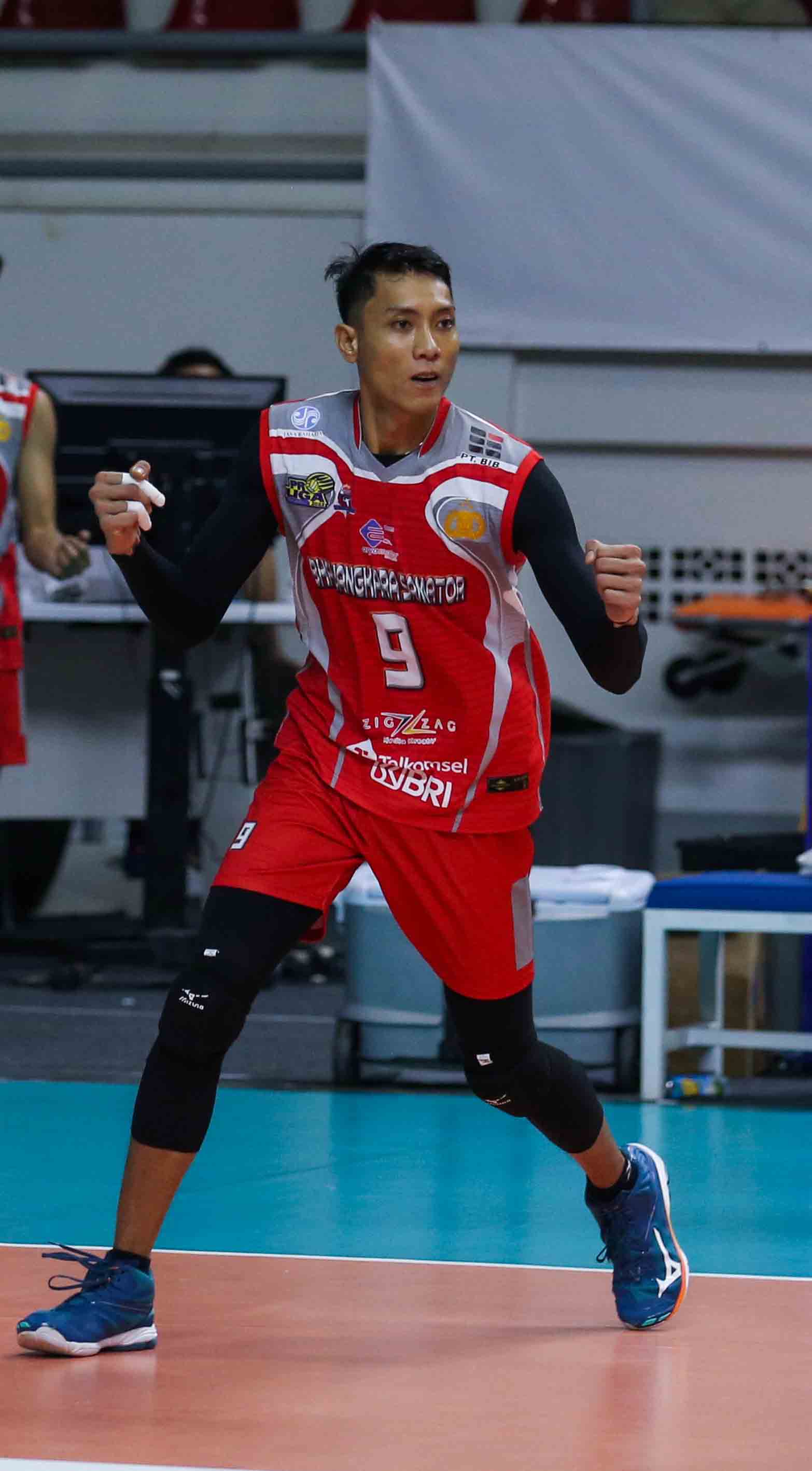 Yuda Mardiansyah Putra (9) pemain bola voli putra Surabaya Bhayangkara Samator meluapkan emosi kegembiraan setelah berhasil mendapatkan poin. Surabaya Bhayangkara Samator kalah dari Bogor LavAni dengan skor 1-3. Pertandingan Proliga 2022 putaran pertama yang berlangsung di GOR Padepokan Voli Jenderal Polisi Kunarto, Sentul, Jum’at (18/2/2022). (Foto : Erly Bahtiar/Sportsmoment.id)