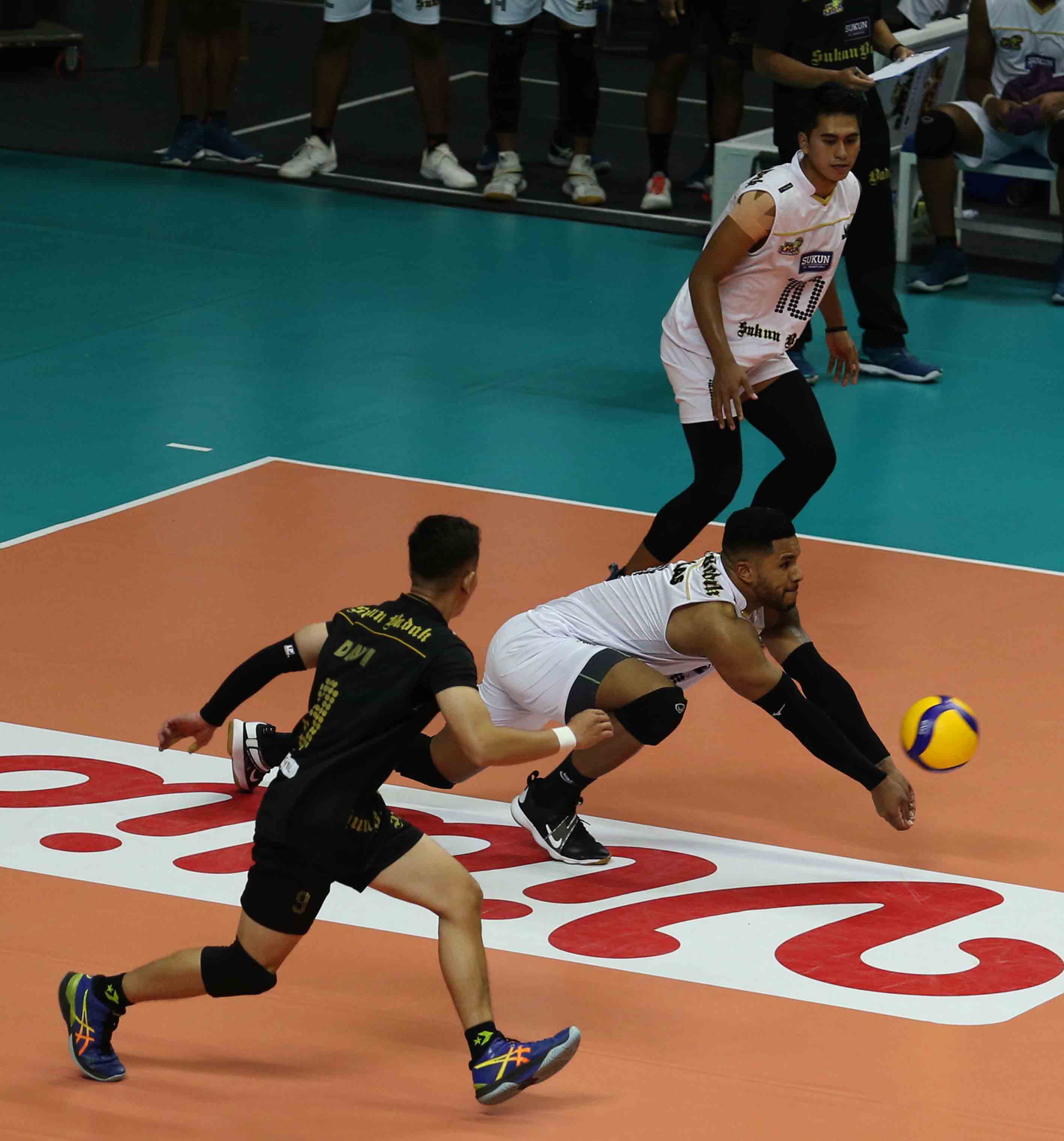 De Farias Bueno Douglas (18) pemain bola voli Kudus Sukun Badak menerima bola lawan. Kudus Sukun Badak berhasil menang dari tim bola voli putra Jakarta Pertamina Pertamax dengan skor 3-0 (25-23, 25-20, 25-22) pada Pertandingan Proliga 2022 putaran pertama yang berlangsung di GOR Padepokan Voli Jenderal Polisi Kunarto, Sentul, Jum’at (21/1/2022). (Foto : Erly Bahtiar/Sportsmoment.id)