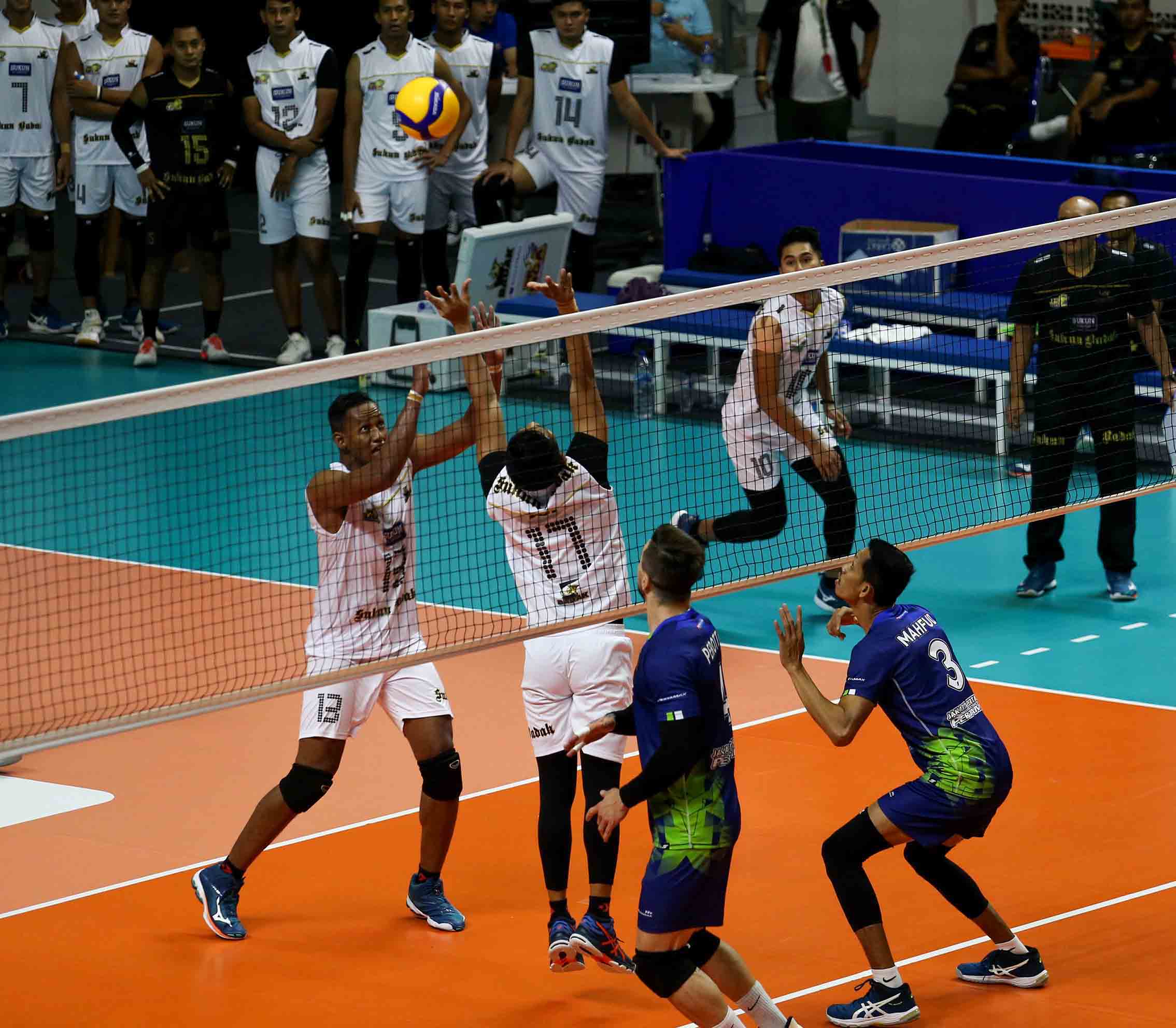 Aji Maulana (17) pemain bola voli Kudus Sukun Badak memberi umpan bola kepada rekannya. Kudus Sukun Badak berhasil menang dari tim bola voli putra Jakarta Pertamina Pertamax dengan skor 3-0 (25-23, 25-20, 25-22) pada Pertandingan Proliga 2022 putaran pertama yang berlangsung di GOR Padepokan Voli Jenderal Polisi Kunarto, Sentul, Jum’at (21/1/2022). (Foto : Erly Bahtiar/Sportsmoment.id)