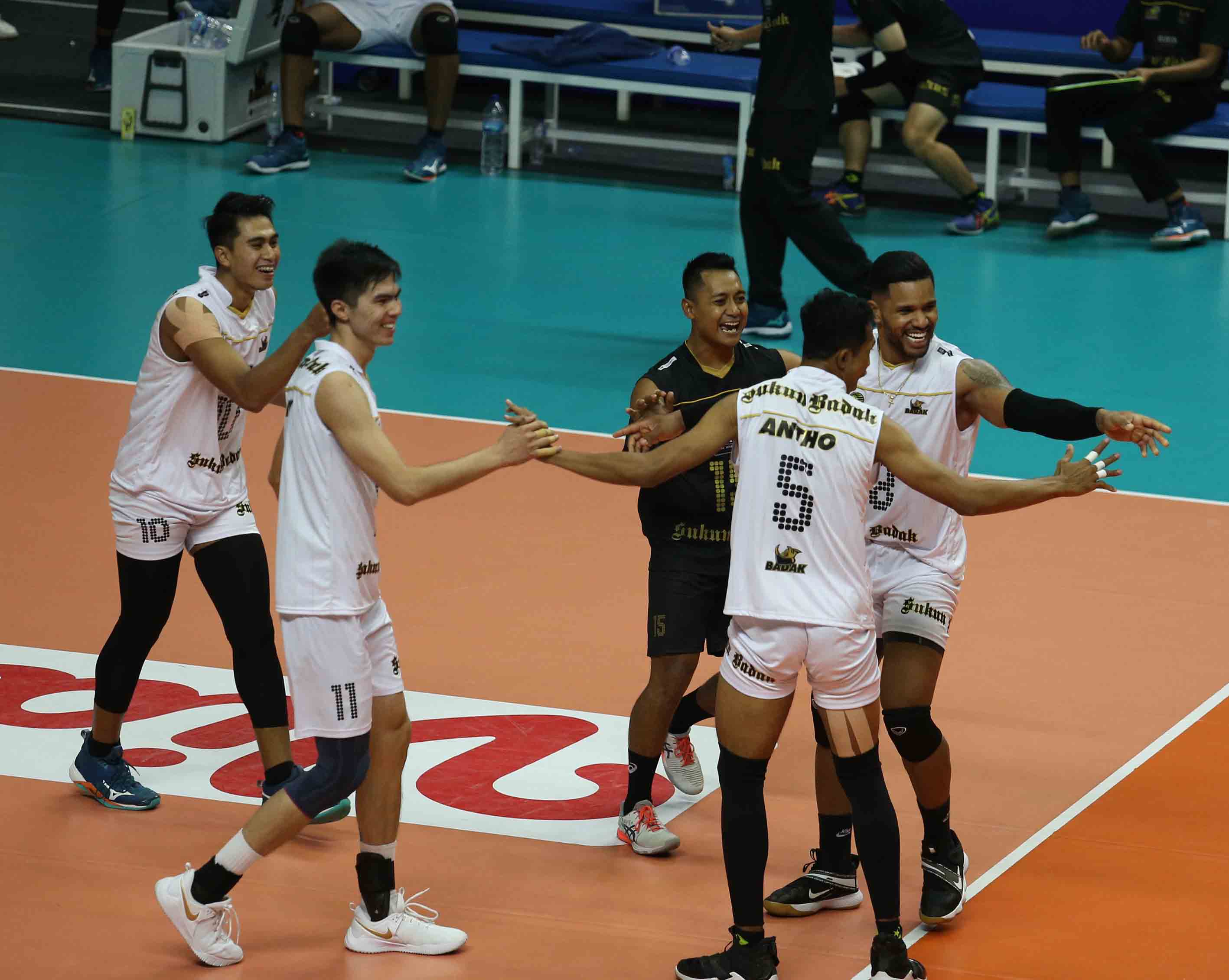 Pemain putra Kudus Sukun Badak meluapkan emosi kegembiraan setelah berhasil meraih poin. Kudus Sukun Badak berhasil menang dari tim bola voli putra Jakarta Pertamina Pertamax dengan skor 3-0 (25-23, 25-20, 25-22) pada Pertandingan Proliga 2022 putaran pertama yang berlangsung di GOR Padepokan Voli Jenderal Polisi Kunarto, Sentul, Jum’at (21/1/2022). (Foto : Erly Bahtiar/Sportsmoment.id)