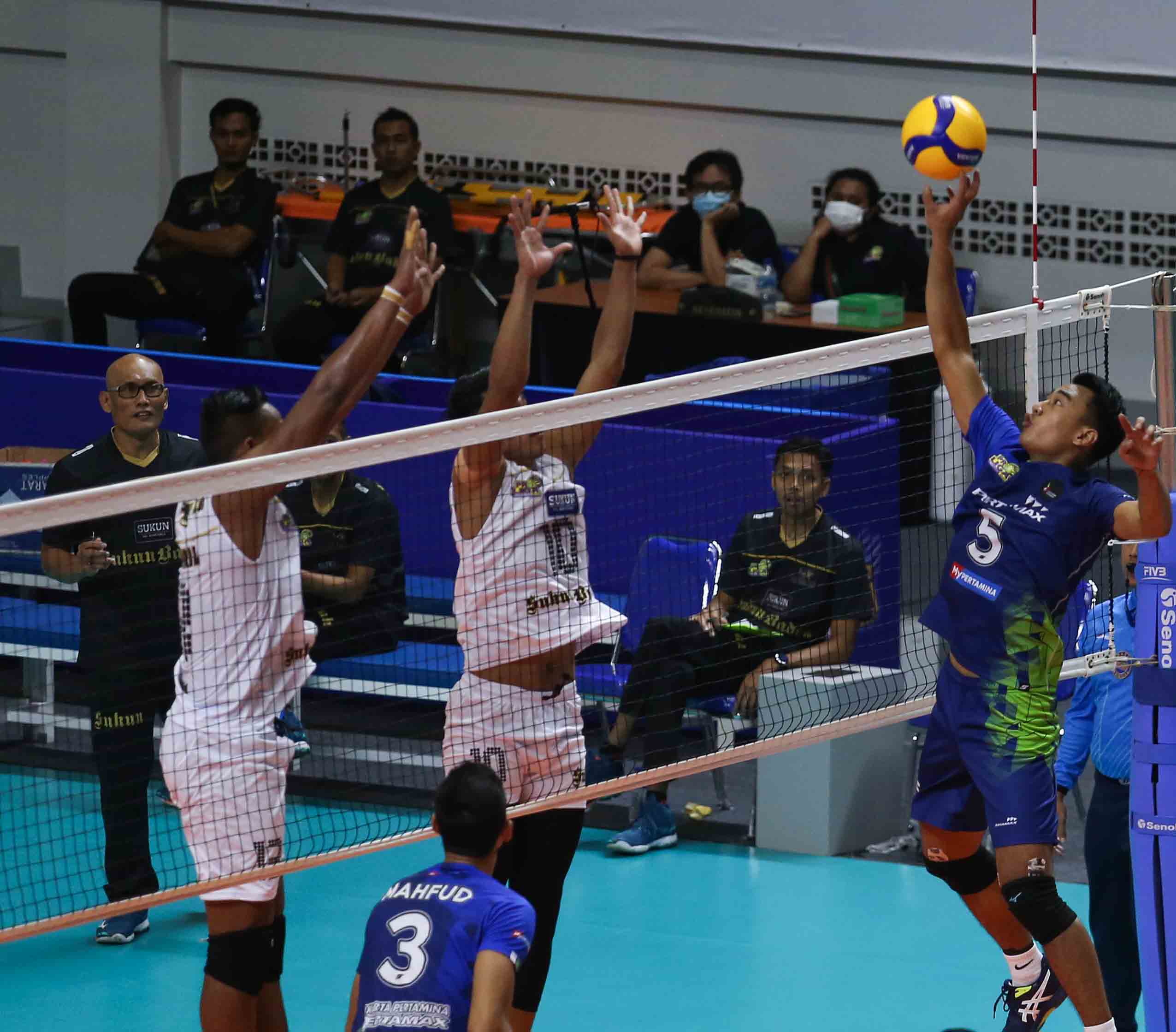 Muhamad Fikri Mustopa Kamal (5) pemain bola voli Jakarta Pertamina Pertamax mengarahkan pukulan ke area lawan. Jakarta Pertamina Pertamax harus mengakui keunggulan tim bola voli putra Kudus Sukun Badak dengan skor 0-3 (23-25, 20-25, 22-25) pada Pertandingan Proliga 2022 putaran pertama yang berlangsung di GOR Padepokan Voli Jenderal Polisi Kunarto, Sentul, Jum’at (21/1/2022). (Foto : Erly Bahtiar/Sportsmoment.id)