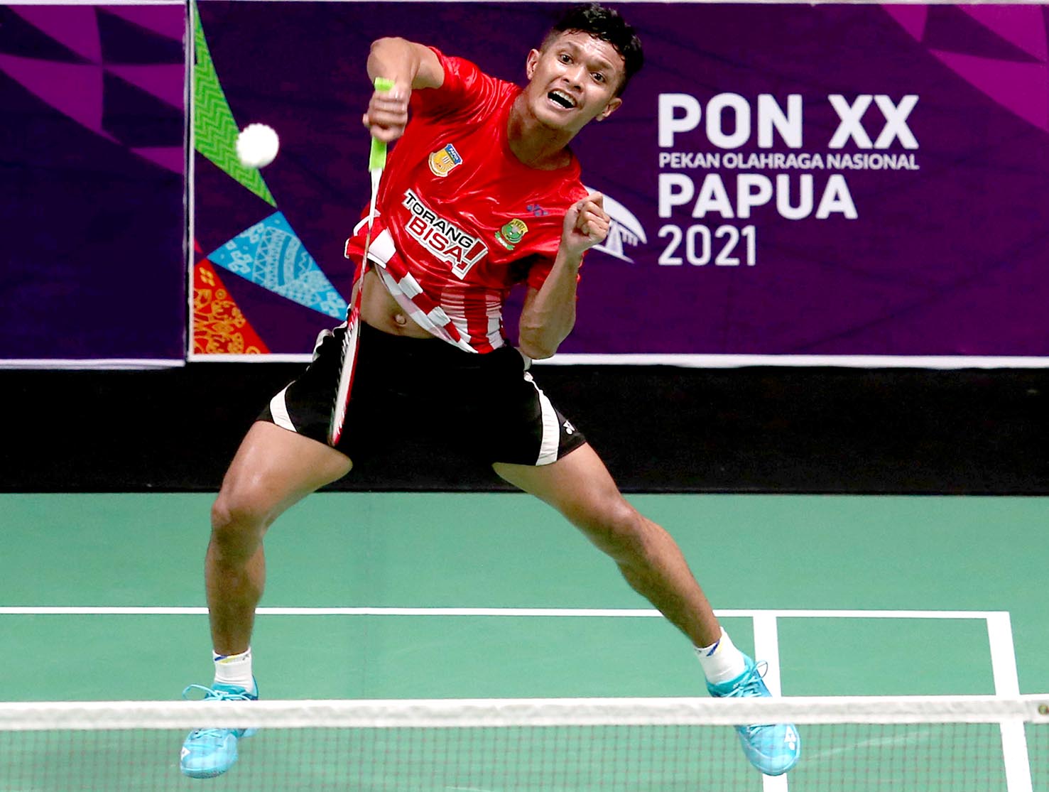 Pebulutangkis Putra M Parera saat mewakili Provinsi Papua dalam pertandingan penyisihan grup putra beregu di GOR Waringin,Abepura, Jayapura.Selasa 6 Oktober 2021 (Foto : PB PON XX PAPUA/Hadi Abdulloh),