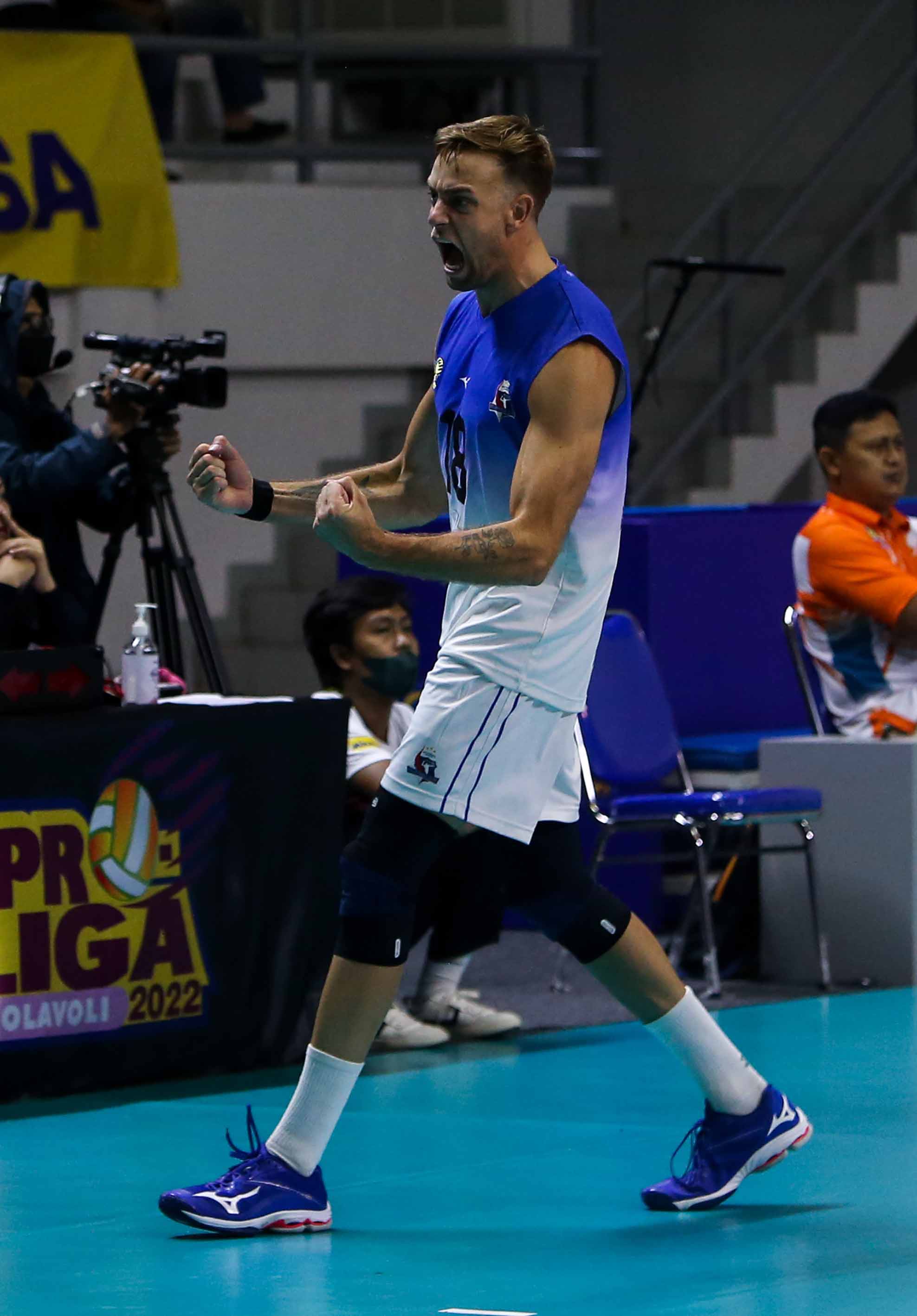 Tim Robert Taylor (18) pemain bola voli Surabaya Bhayangkara Samator meluapkan emosi kegembiraan setelah berhasil menyumbangkan poin. Surabaya Bhayangkara Samator harus mengakui keunggulan tim bola voli putra Jakarta BNI 46 dengan skor 2-3 (30-32, 33-31, 20-25, 26-24, 15-17) pada Pertandingan Proliga 2022 putaran pertama yang berlangsung di GOR Padepokan Voli Jenderal Polisi Kunarto, Sentul, Jum’at (14/1/2022). (Foto : Erly Bahtiar/Sportsmoment.id)