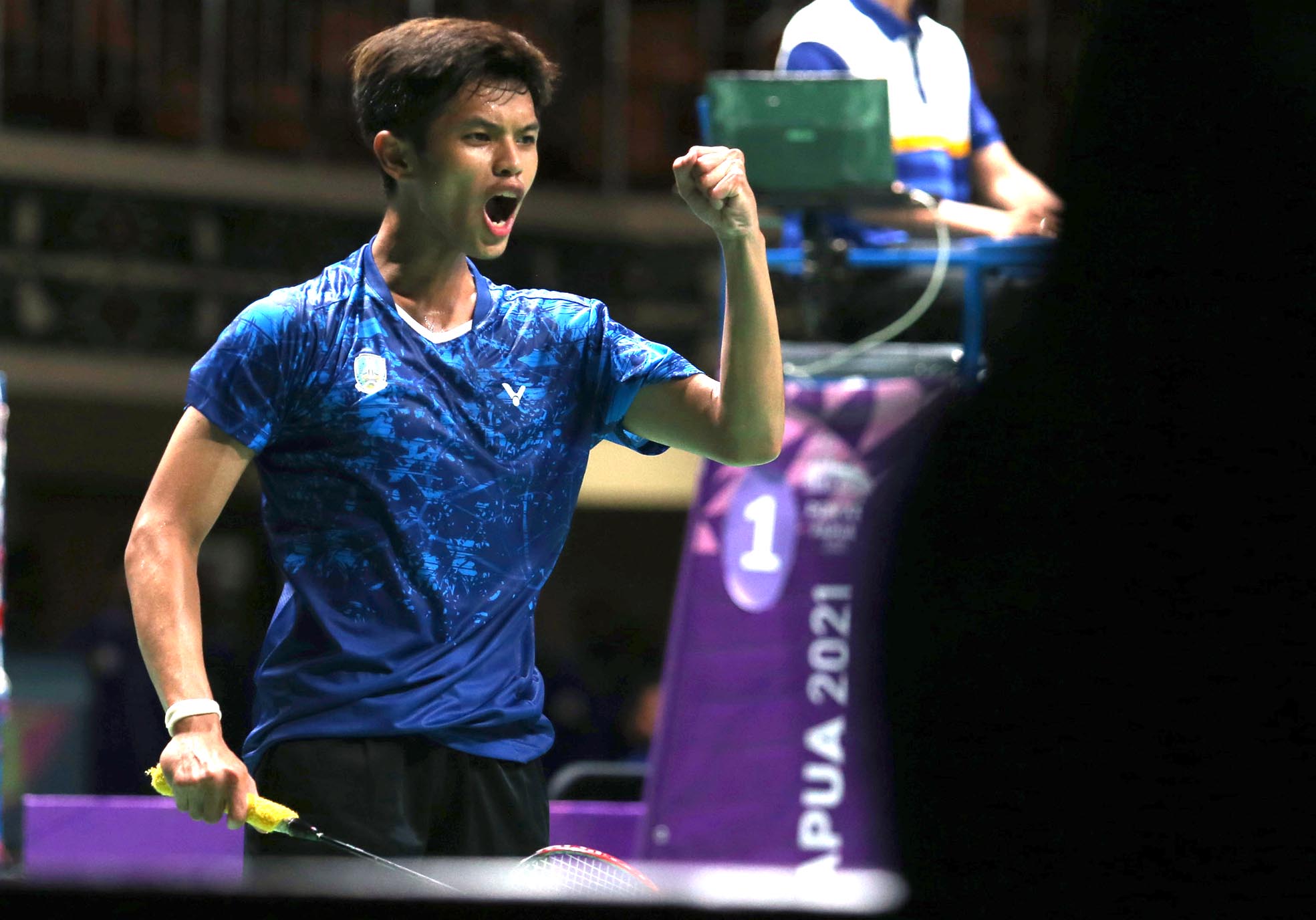 Pebulutangkis Putra Aldi Firmansyah mengepalkan tangan setelah mencuri point atas lawannya prabu wenang,Banten.Aldi menjadi juru kunci kemenangan atas Tim Putra Jawa Timur untuk melaju ke perdelapan final,Tim Jawa Timur menang atas Tim Banten dengan skor 3-2 pada pertandingan penyisihan Grup Putra Beregu di GOR Waringin,Abepura,Jayapura.Kamis, 7 Oktober 2021, (Foto : PB PON XX PAPUA/Hadi Abdulloh)