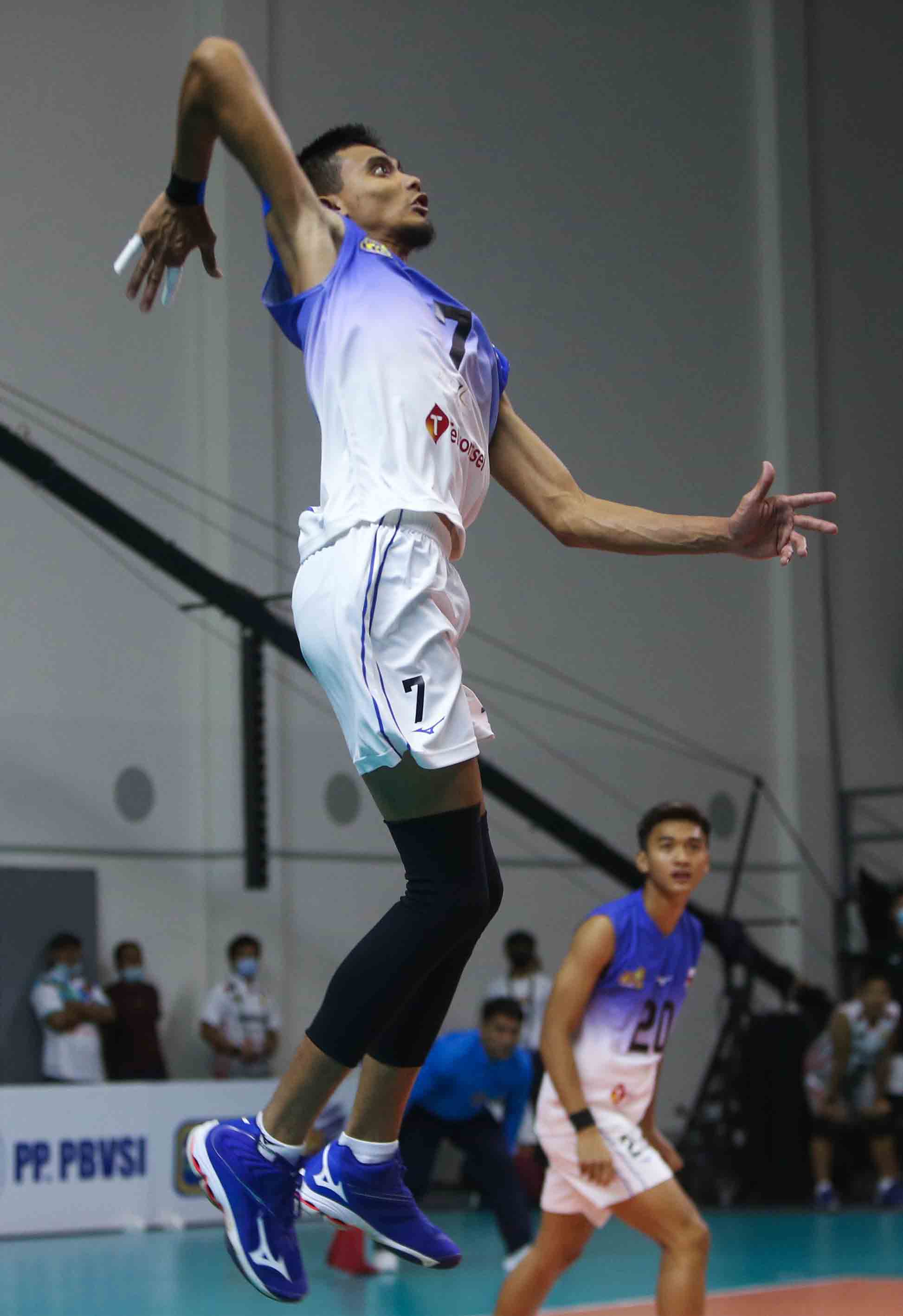 Samsul Kohar (7) pemain bola voli Surabaya Bhayangkara Samator mengarahkan pukulan smashnya ke area lawan. Surabaya Bhayangkara Samator harus mengakui keunggulan tim bola voli putra Jakarta BNI 46 dengan skor 2-3 (30-32, 33-31, 20-25, 26-24, 15-17) pada Pertandingan Proliga 2022 putaran pertama yang berlangsung di GOR Padepokan Voli Jenderal Polisi Kunarto, Sentul, Jum’at (14/1/2022). (Foto : Erly Bahtiar/Sportsmoment.id)