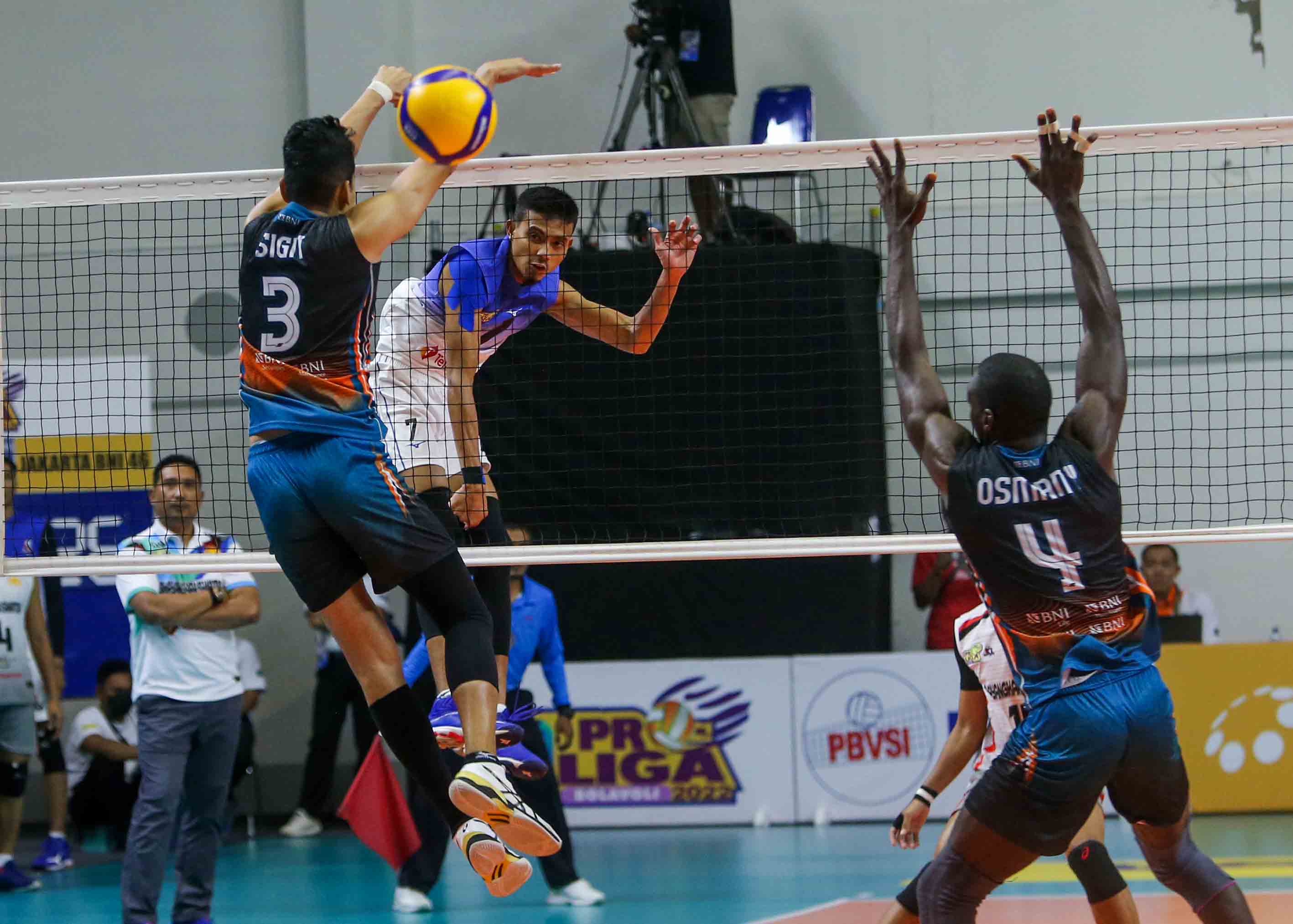 Samsul Kohar (7) pemain bola voli Surabaya Bhayangkara Samator mengarahkan pukulan smashnya ke area lawan. Surabaya Bhayangkara Samator harus mengakui keunggulan tim bola voli putra Jakarta BNI 46 dengan skor 2-3 (30-32, 33-31, 20-25, 26-24, 15-17) pada Pertandingan Proliga 2022 putaran pertama yang berlangsung di GOR Padepokan Voli Jenderal Polisi Kunarto, Sentul, Jum’at (14/1/2022). (Foto : Erly Bahtiar/Sportsmoment.id)