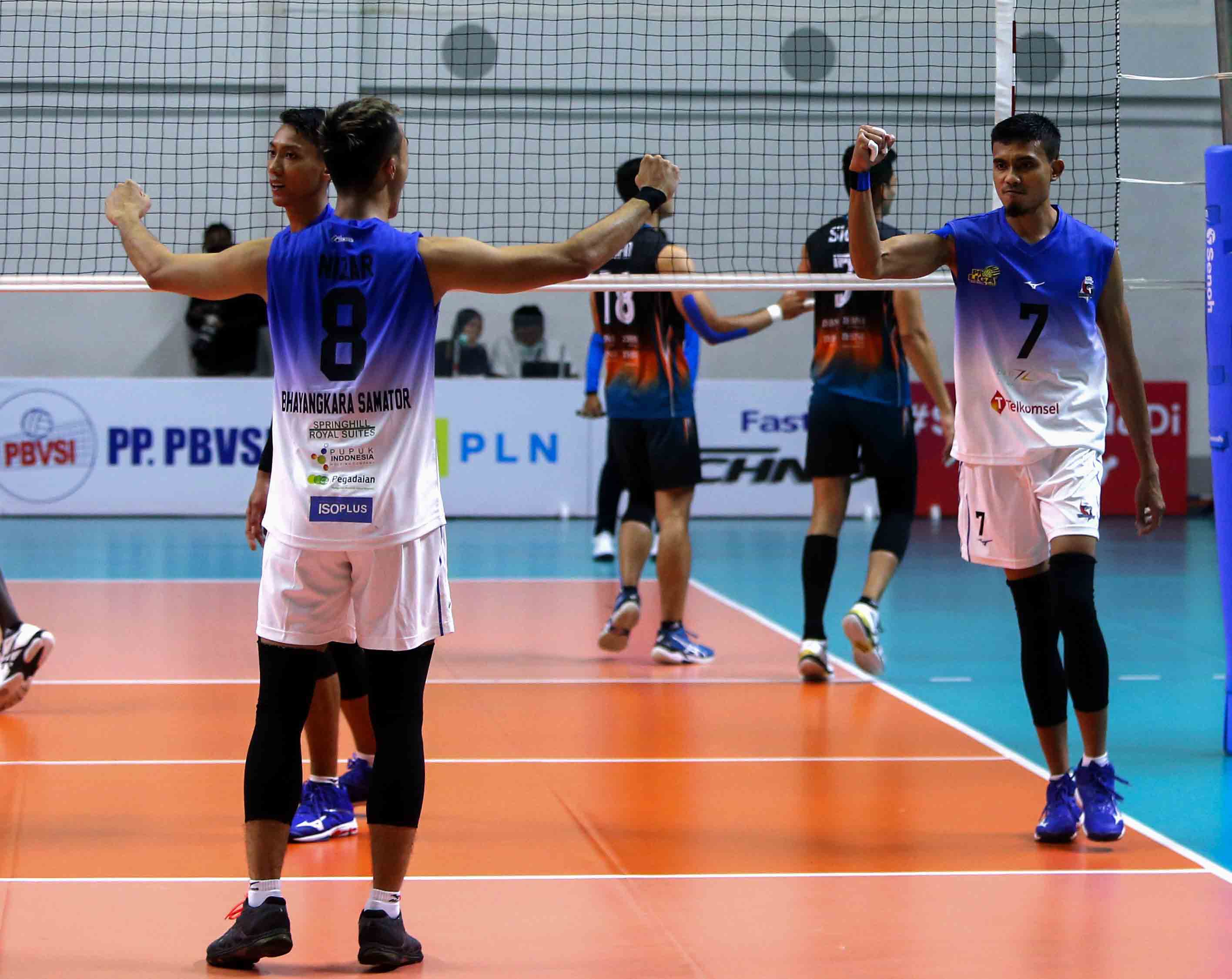 Samsul Kohar (7) pemain bola voli Surabaya Bhayangkara Samator meluapkan emosi kegembiraan setelah berhasil meraih poin. Surabaya Bhayangkara Samator harus mengakui keunggulan tim bola voli putra Jakarta BNI 46 dengan skor 2-3 (30-32, 33-31, 20-25, 26-24, 15-17) pada Pertandingan Proliga 2022 putaran pertama yang berlangsung di GOR Padepokan Voli Jenderal Polisi Kunarto, Sentul, Jum’at (14/1/2022). (Foto : Erly Bahtiar/Sportsmoment.id)