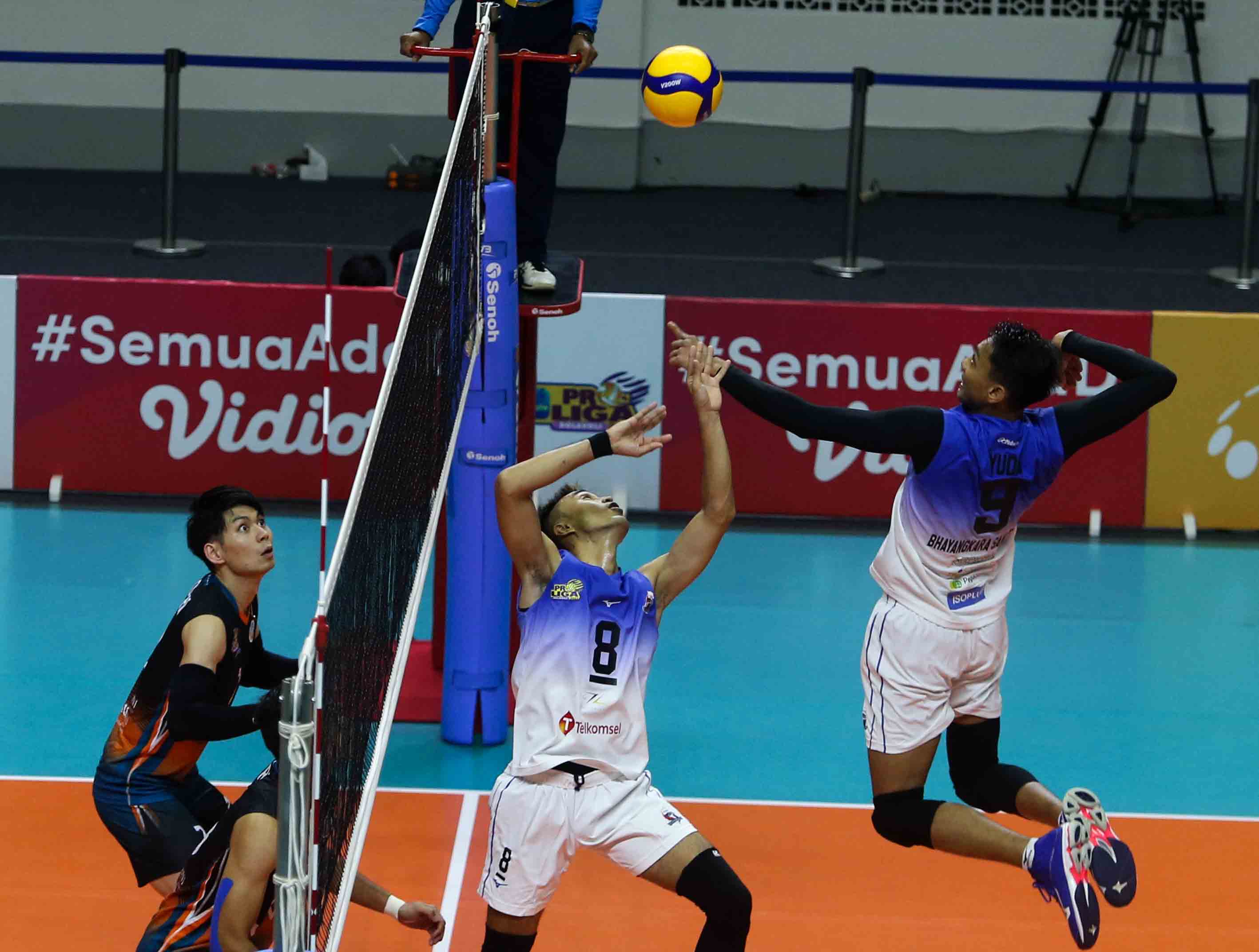 Yuda Mardiansyah Putra (9) pemain bola voli Surabaya Bhayangkara Samator mengarahkan pukulan smashnya ke area lawan. Surabaya Bhayangkara Samator harus mengakui keunggulan tim bola voli putra Jakarta BNI 46 dengan skor 2-3 (30-32, 33-31, 20-25, 26-24, 15-17) pada Pertandingan Proliga 2022 putaran pertama yang berlangsung di GOR Padepokan Voli Jenderal Polisi Kunarto, Sentul, Jum’at (14/1/2022). (Foto : Erly Bahtiar/Sportsmoment.id)