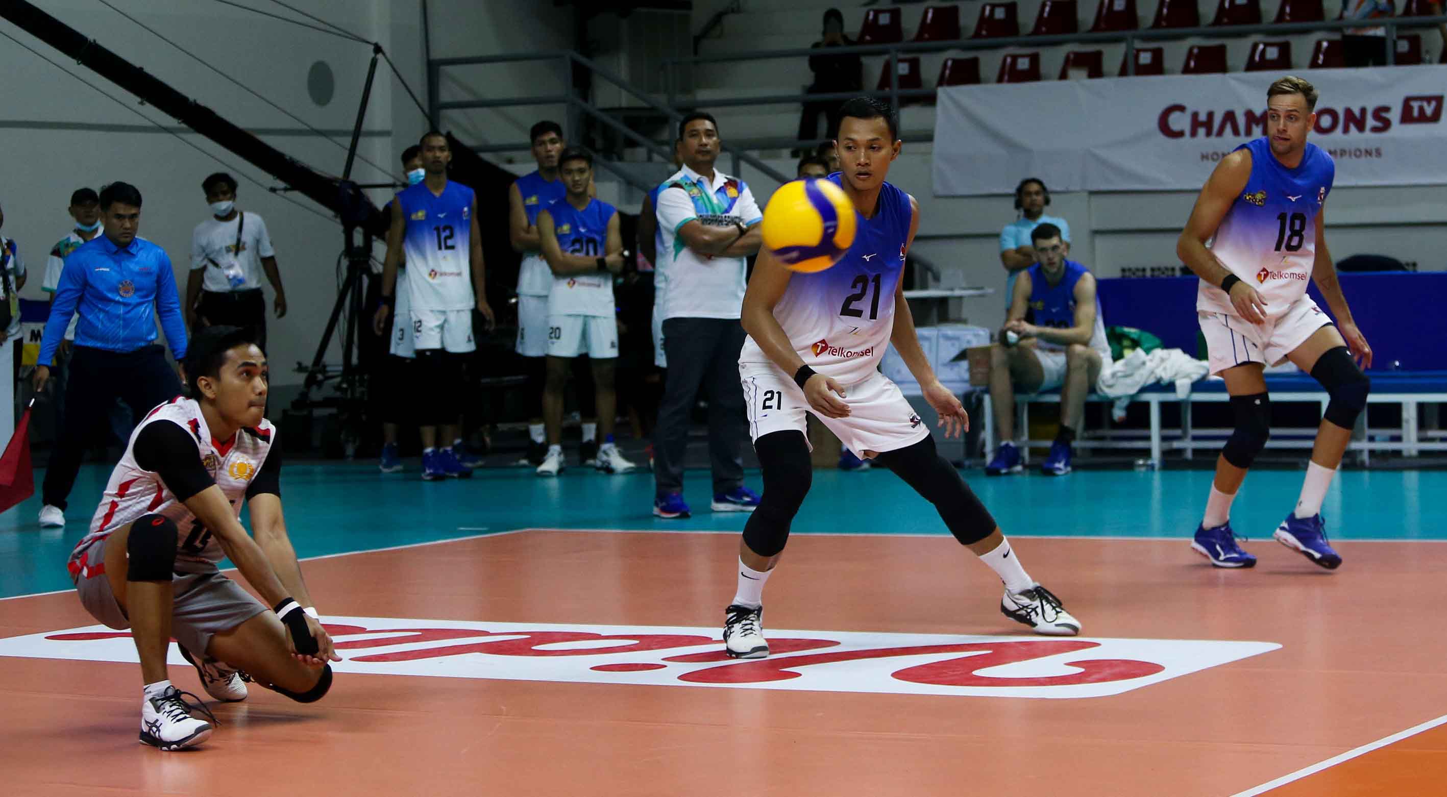 Fahreza Rakha Abhinaya (19) pemain bola voli Surabaya Bhayangkara Samator menerima bola lawan. Surabaya Bhayangkara Samator harus mengakui keunggulan tim bola voli putra Jakarta BNI 46 dengan skor 2-3 (30-32, 33-31, 20-25, 26-24, 15-17) pada Pertandingan Proliga 2022 putaran pertama yang berlangsung di GOR Padepokan Voli Jenderal Polisi Kunarto, Sentul, Jum’at (14/1/2022). (Foto : Erly Bahtiar/Sportsmoment.id)