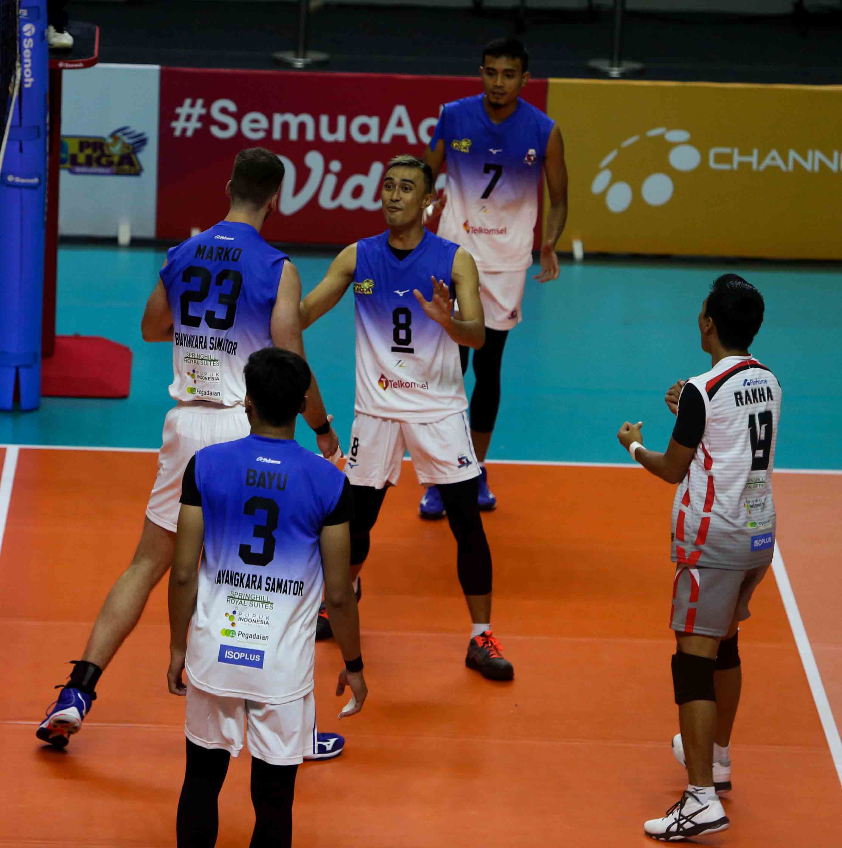 Pemain bola voli putra Surabaya Bhayangkara Samator meluapkan emosi kegembiraan setelah berhasil meraih poin. Surabaya Bhayangkara Samator harus mengakui keunggulan tim bola voli putra Jakarta BNI 46 dengan skor 2-3 (30-32, 33-31, 20-25, 26-24, 15-17) pada Pertandingan Proliga 2022 putaran pertama yang berlangsung di GOR Padepokan Voli Jenderal Polisi Kunarto, Sentul, Jum’at (14/1/2022). (Foto : Erly Bahtiar/Sportsmoment.id)
