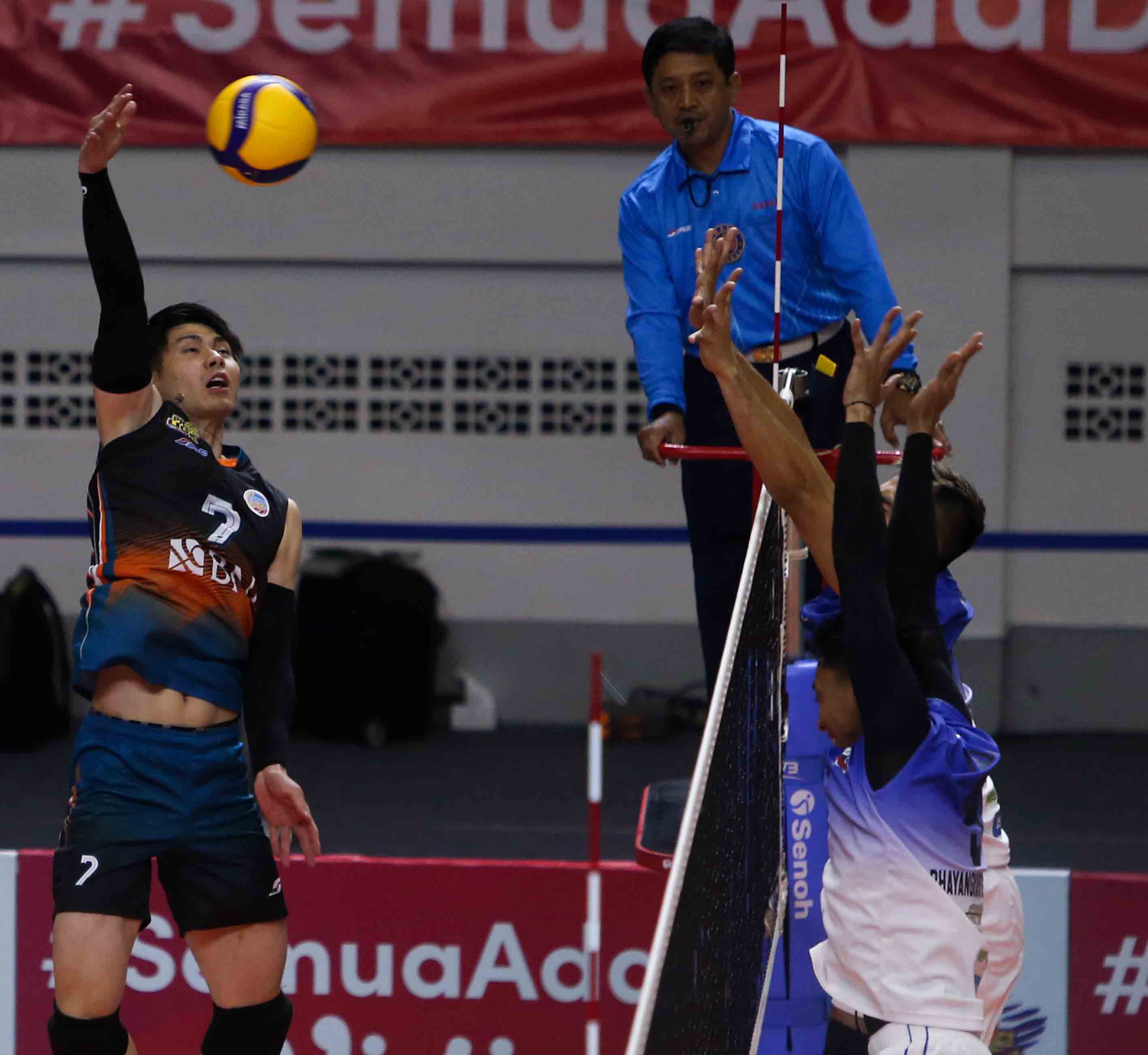 Takahiro Tozaki (7) pemain bola voli Jakarta BNI 46 mengarahkan pukulan smashnya ke area lawan. Jakarta BNI 46 menang atas tim bola voli putra Surabaya Bhayangkara Samator dengan skor 3-2 (32-30, 31-33, 25-20, 24-26, 17-15) pada Pertandingan Proliga 2022 putaran pertama yang berlangsung di GOR Padepokan Voli Jenderal Polisi Kunarto, Sentul, Jum’at (14/1/2022). (Foto : Erly Bahtiar/Sportsmoment.id)