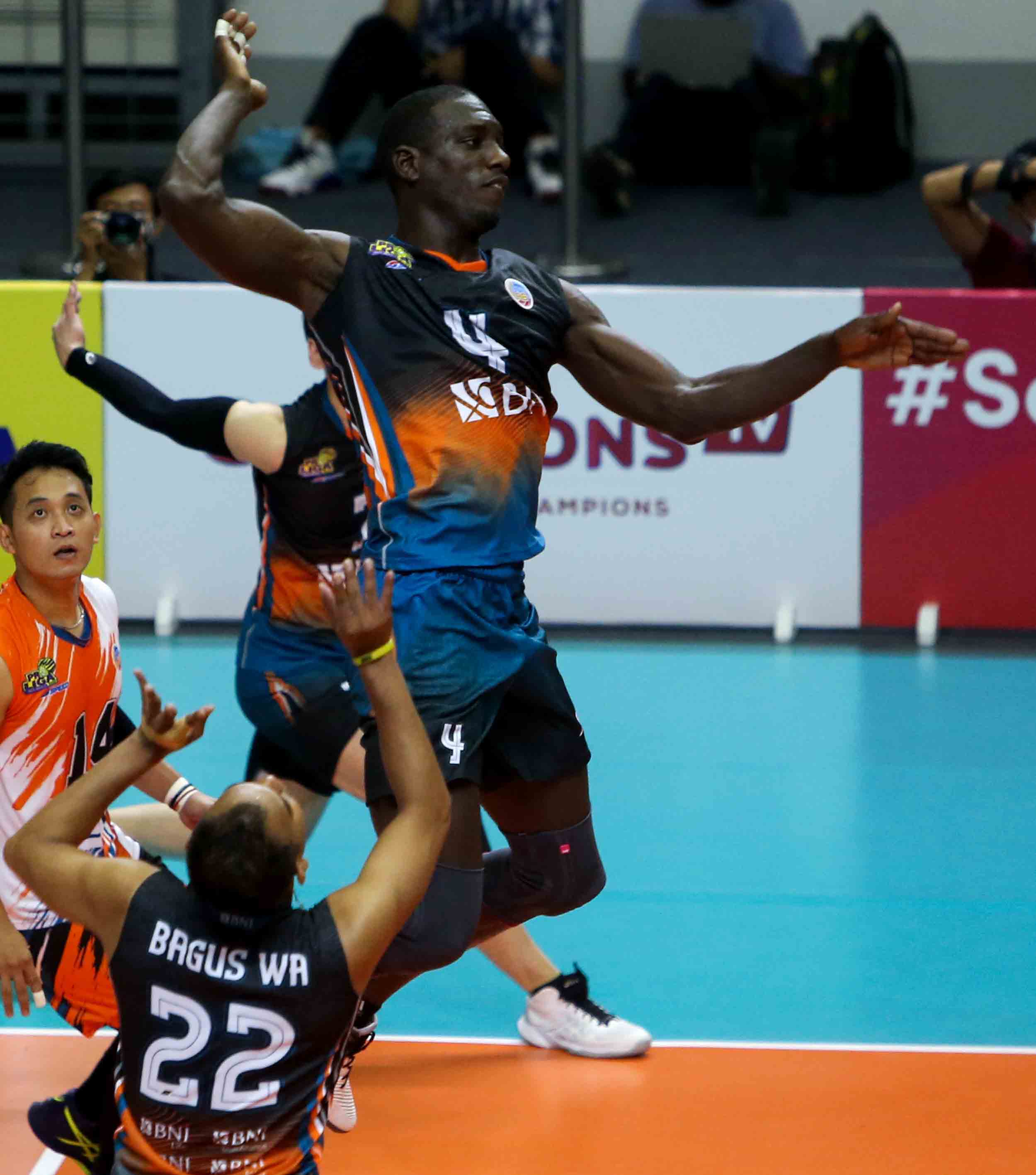 Camejo Durruthy Osmany (4) pemain bola voli Jakarta BNI 46 mengarahkan pukulan smashnya ke area lawan. Jakarta BNI 46 menang atas tim bola voli putra Surabaya Bhayangkara Samator dengan skor 3-2 (32-30, 31-33, 25-20, 24-26, 17-15) pada Pertandingan Proliga 2022 putaran pertama yang berlangsung di GOR Padepokan Voli Jenderal Polisi Kunarto, Sentul, Jum’at (14/1/2022). (Foto : Erly Bahtiar/Sportsmoment.id)