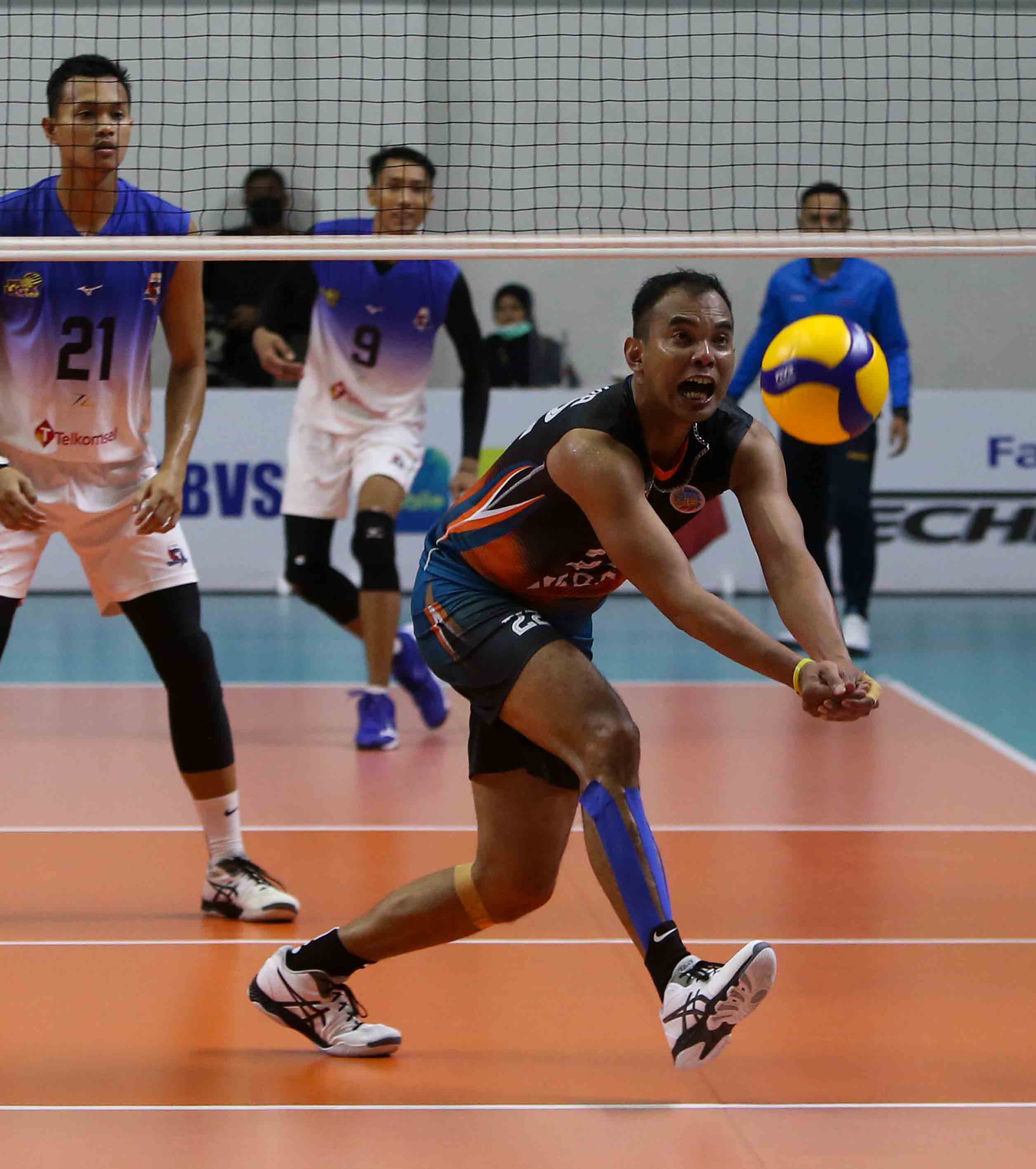 Bagus Wahyu Ardianto (22) pemain bola voli Jakarta BNI 46 menerima bola lawan. Jakarta BNI 46 menang atas tim bola voli putra Surabaya Bhayangkara Samator dengan skor 3-2 (32-30, 31-33, 25-20, 24-26, 17-15) pada Pertandingan Proliga 2022 putaran pertama yang berlangsung di GOR Padepokan Voli Jenderal Polisi Kunarto, Sentul, Jum’at (14/1/2022). (Foto : Erly Bahtiar/Sportsmoment.id)
