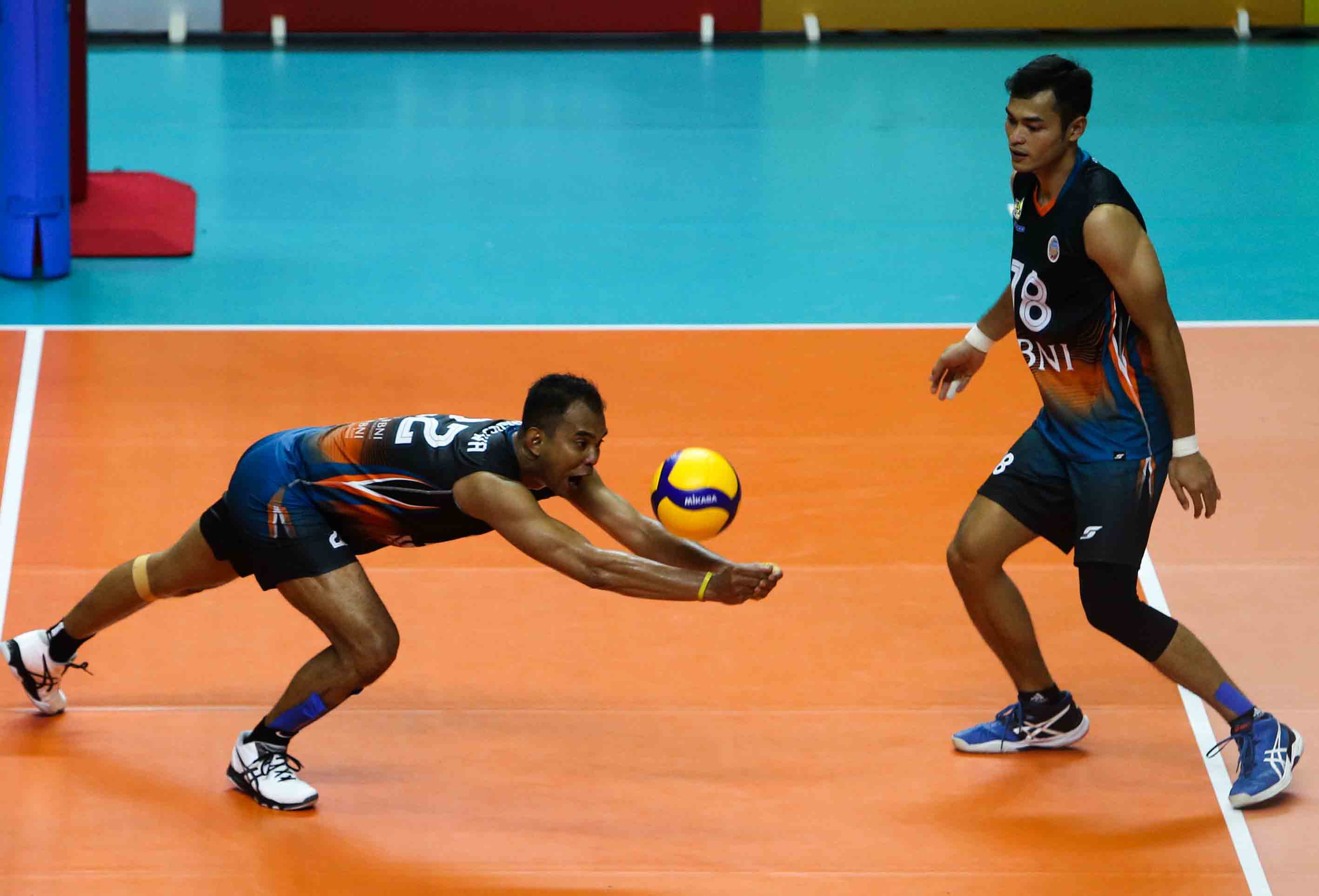 Bagus Wahyu Ardianto (22) pemain bola voli Jakarta BNI 46 menerima bola lawan. Jakarta BNI 46 menang atas tim bola voli putra Surabaya Bhayangkara Samator dengan skor 3-2 (32-30, 31-33, 25-20, 24-26, 17-15) pada Pertandingan Proliga 2022 putaran pertama yang berlangsung di GOR Padepokan Voli Jenderal Polisi Kunarto, Sentul, Jum’at (14/1/2022). (Foto : Erly Bahtiar/Sportsmoment.id)