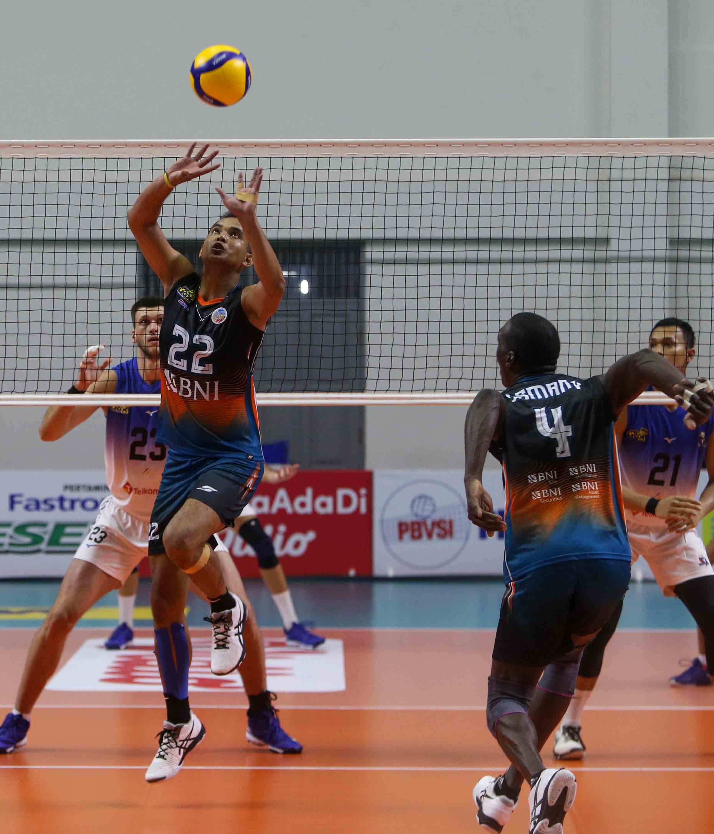 Bagus Wahyu Ardianto (22) pemain bola voli Jakarta BNI 46 memberikan umpan bola ke rekannya. Jakarta BNI 46 menang atas tim bola voli putra Surabaya Bhayangkara Samator dengan skor 3-2 (32-30, 31-33, 25-20, 24-26, 17-15) pada Pertandingan Proliga 2022 putaran pertama yang berlangsung di GOR Padepokan Voli Jenderal Polisi Kunarto, Sentul, Jum’at (14/1/2022). (Foto : Erly Bahtiar/Sportsmoment.id)