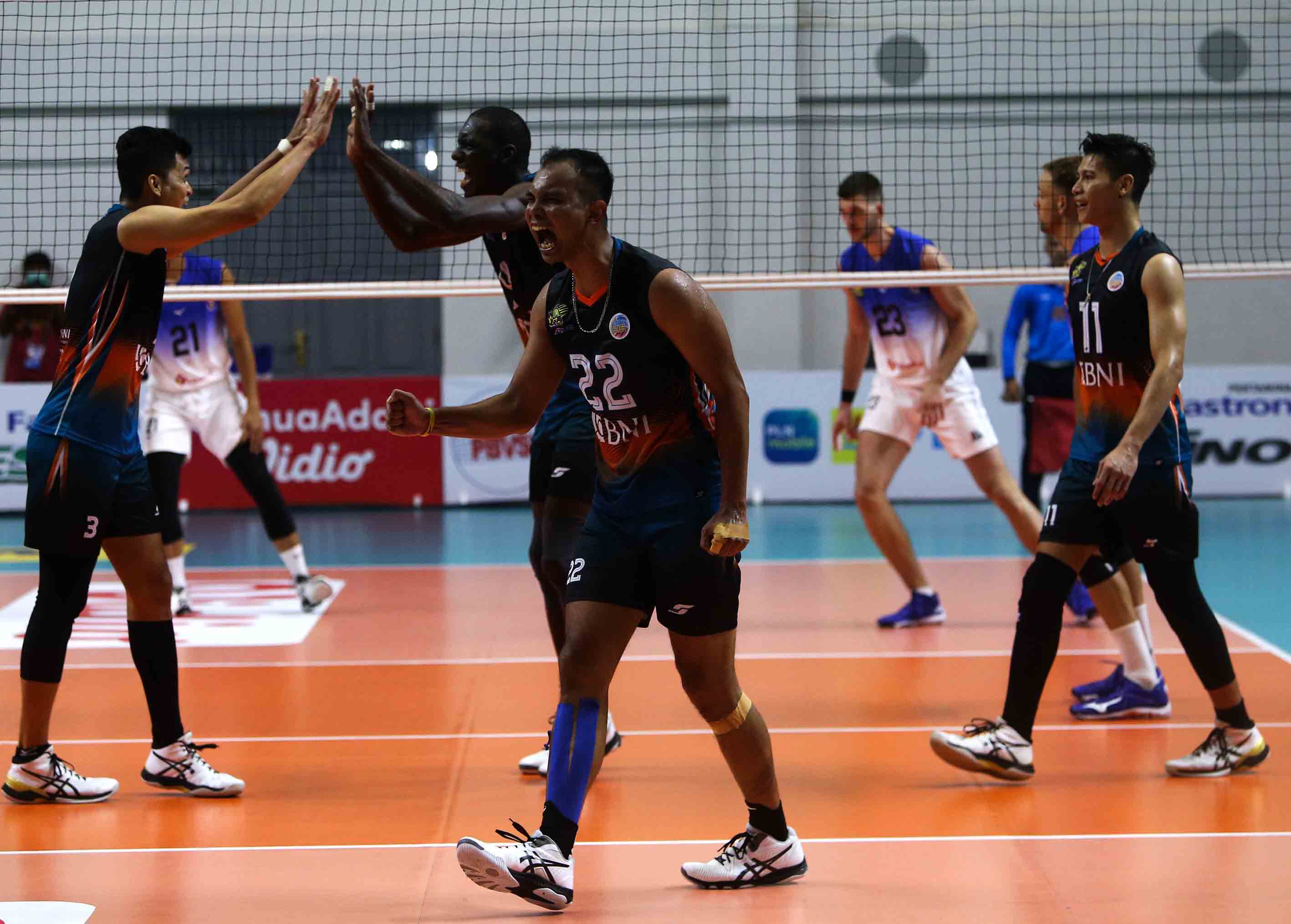 Bagus Wahyu Ardianto (22) pemain bola voli Jakarta BNI 46 meluapkan emosi kegembiraan setelah berhasil meraih poin. Jakarta BNI 46 menang atas tim bola voli putra Surabaya Bhayangkara Samator dengan skor 3-2 (32-30, 31-33, 25-20, 24-26, 17-15) pada Pertandingan Proliga 2022 putaran pertama yang berlangsung di GOR Padepokan Voli Jenderal Polisi Kunarto, Sentul, Jum’at (14/1/2022). (Foto : Erly Bahtiar/Sportsmoment.id)
