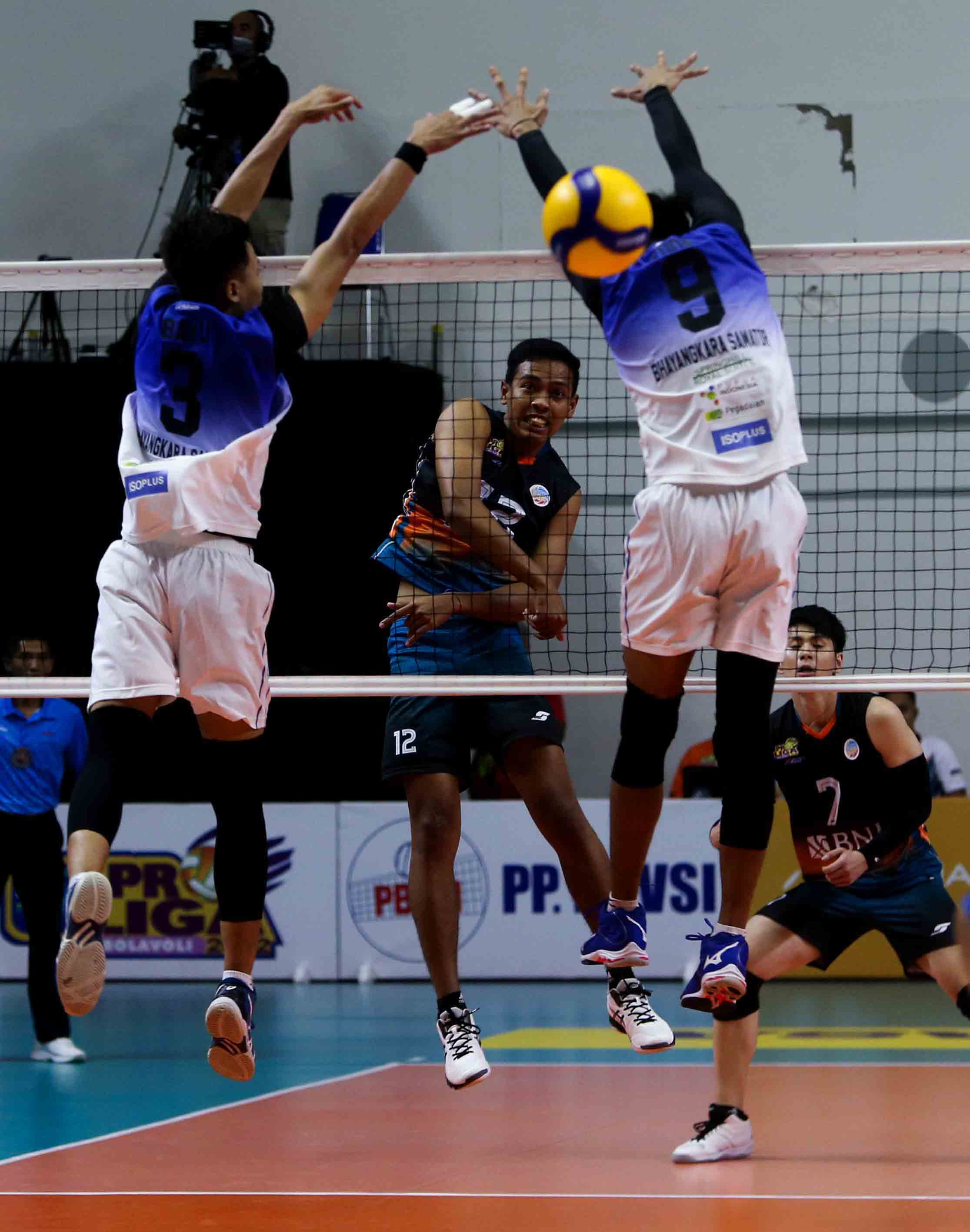 Riko Arnanda Pratama (12) pemain bola voli Jakarta BNI 46 mengarahkan pukulan smashnya ke area lawan. Jakarta BNI 46 menang atas tim bola voli putra Surabaya Bhayangkara Samator dengan skor 3-2 (32-30, 31-33, 25-20, 24-26, 17-15) pada Pertandingan Proliga 2022 putaran pertama yang berlangsung di GOR Padepokan Voli Jenderal Polisi Kunarto, Sentul, Jum’at (14/1/2022). (Foto : Erly Bahtiar/Sportsmoment.id)