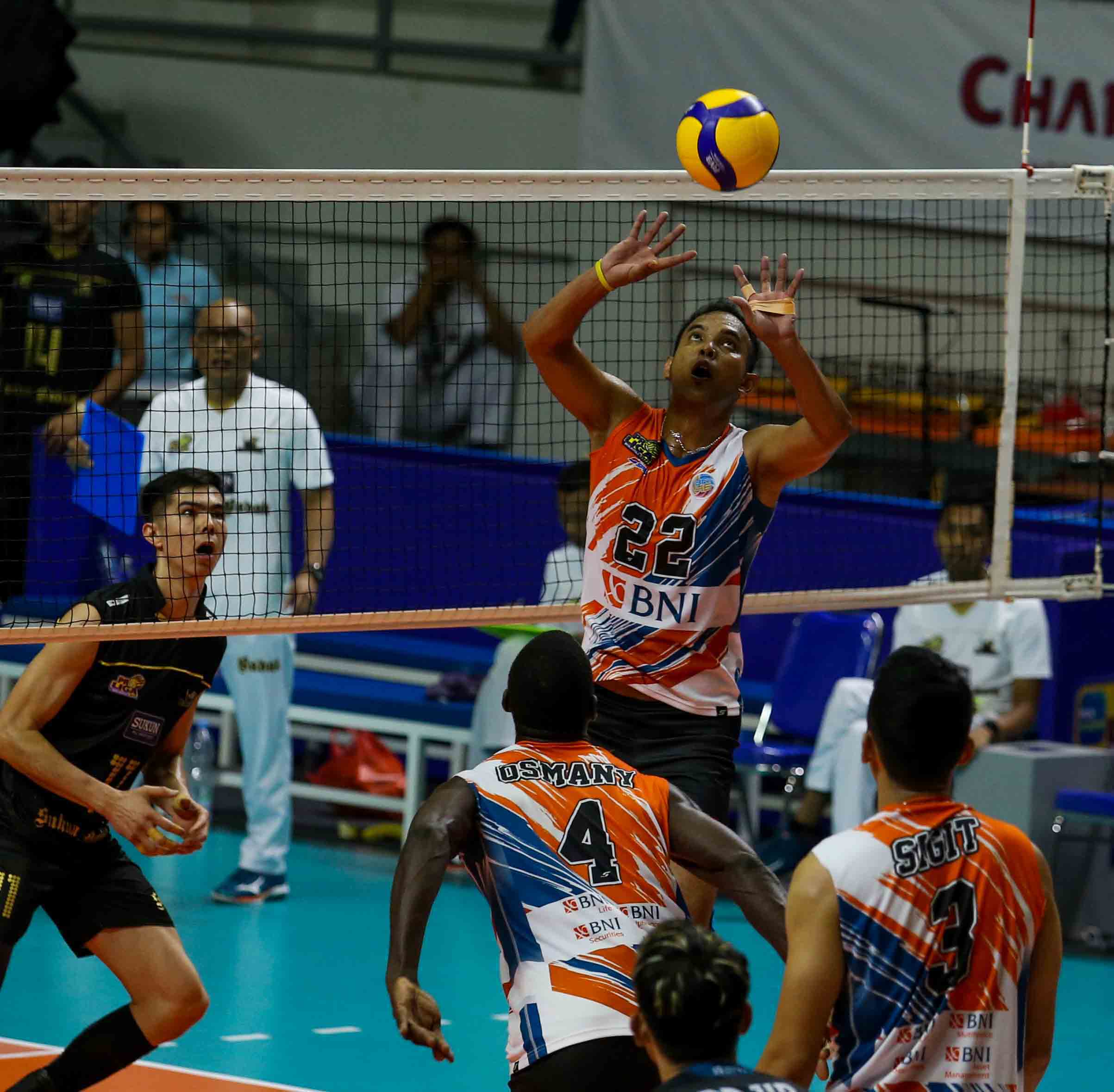 Bagus Wahyu Ardianto (22) pemain bola voli Jakarta BNI 46 memberikan umpan bola ke rekannya. Jakarta BNI 46 menang atas tim bola voli putra Kudus Sukun Badak dengan skor 3-2 (25-18, 20-25, 25-16, 23-25, 15-12) pada Pertandingan Proliga 2022 putaran pertama yang berlangsung di GOR Padepokan Voli Jenderal Polisi Kunarto, Sentul, Jum’at (28/1/2022). (Foto : Erly Bahtiar/Sportsmoment.id)