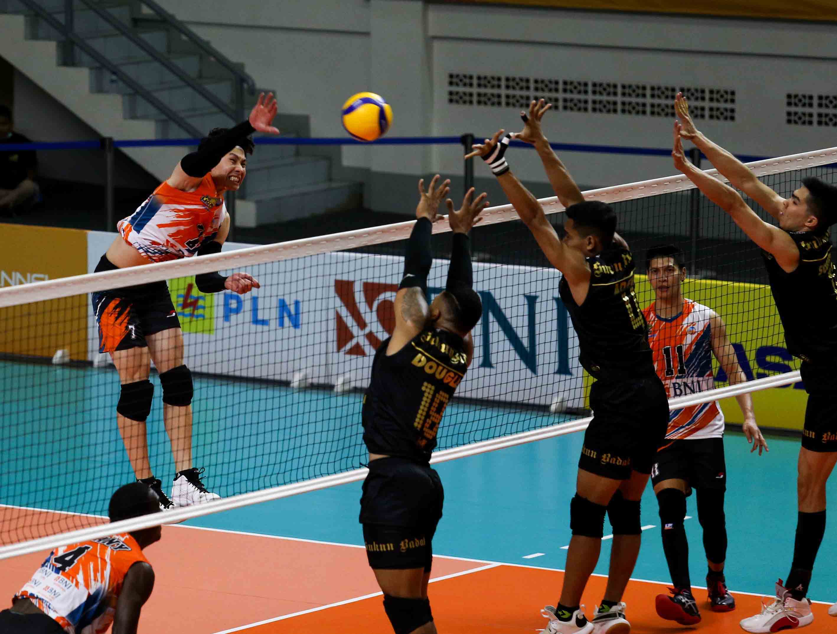 Takahiro Tozaki (7) pemain bola voli Jakarta BNI 46 mengarahkan pukulan smashnya ke area lawan. Jakarta BNI 46 menang atas tim bola voli putra Kudus Sukun Badak dengan skor 3-2 (25-18, 20-25, 25-16, 23-25, 15-12) pada Pertandingan Proliga 2022 putaran pertama yang berlangsung di GOR Padepokan Voli Jenderal Polisi Kunarto, Sentul, Jum’at (28/1/2022). (Foto : Erly Bahtiar/Sportsmoment.id)