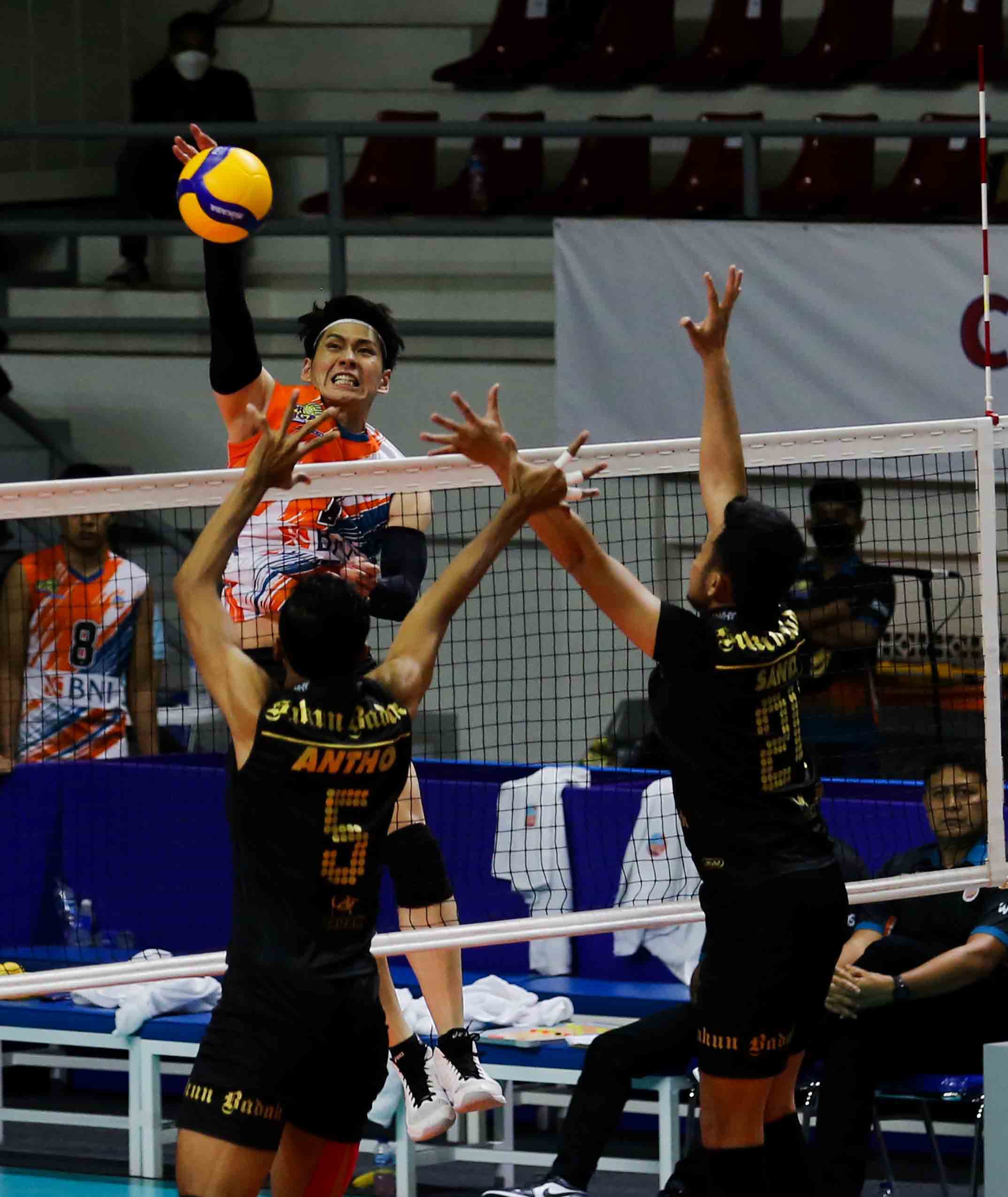 Takahiro Tozaki (7) pemain bola voli Jakarta BNI 46 mengarahkan pukulan smashnya ke area lawan. Jakarta BNI 46 menang atas tim bola voli putra Kudus Sukun Badak dengan skor 3-2 (25-18, 20-25, 25-16, 23-25, 15-12) pada Pertandingan Proliga 2022 putaran pertama yang berlangsung di GOR Padepokan Voli Jenderal Polisi Kunarto, Sentul, Jum’at (28/1/2022). (Foto : Erly Bahtiar/Sportsmoment.id)