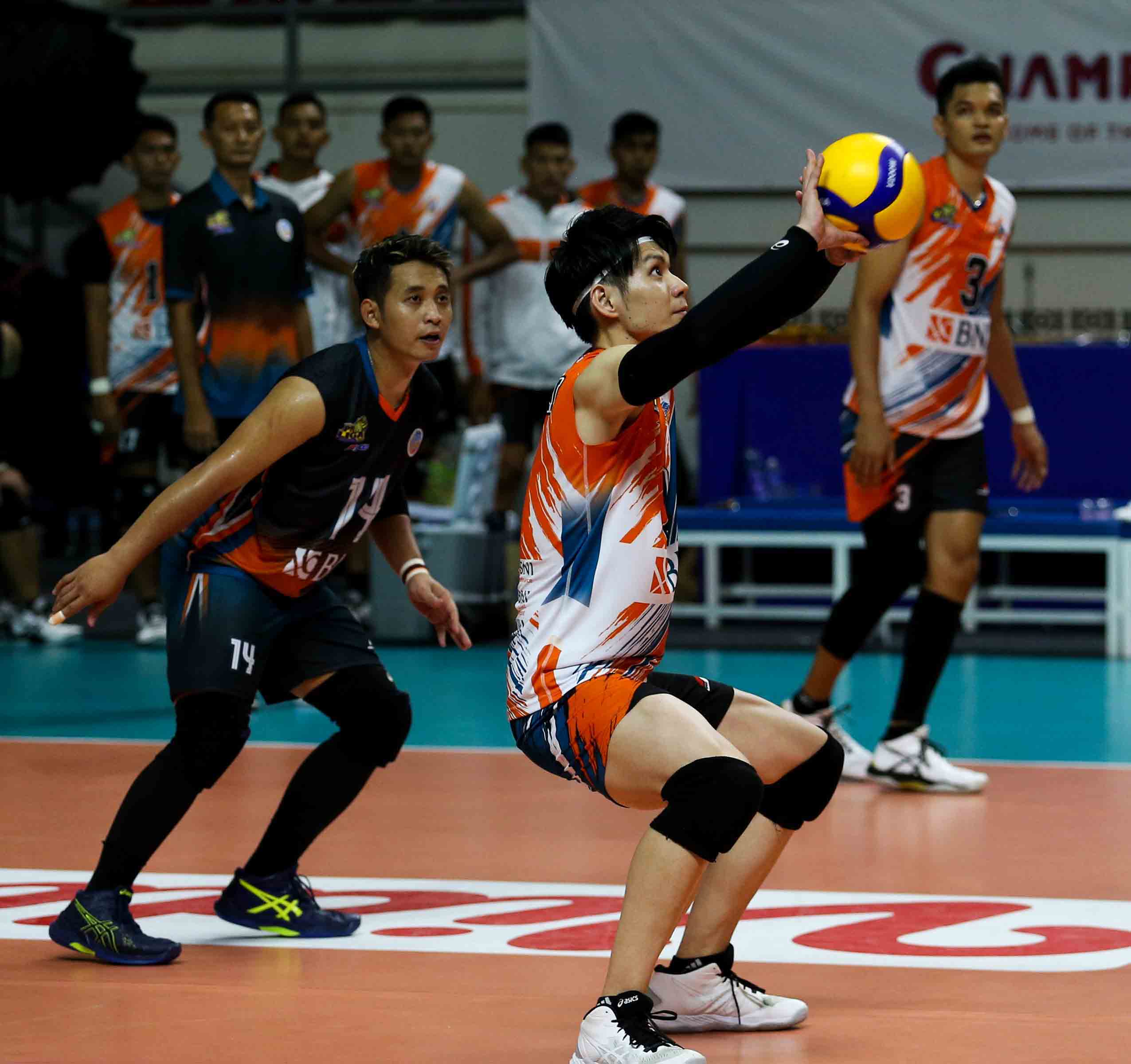 Takahiro Tozaki (7) pemain bola voli Jakarta BNI 46 menerima bola lawan. Jakarta BNI 46 menang atas tim bola voli putra Kudus Sukun Badak dengan skor 3-2 (25-18, 20-25, 25-16, 23-25, 15-12) pada Pertandingan Proliga 2022 putaran pertama yang berlangsung di GOR Padepokan Voli Jenderal Polisi Kunarto, Sentul, Jum’at (28/1/2022). (Foto : Erly Bahtiar/Sportsmoment.id)