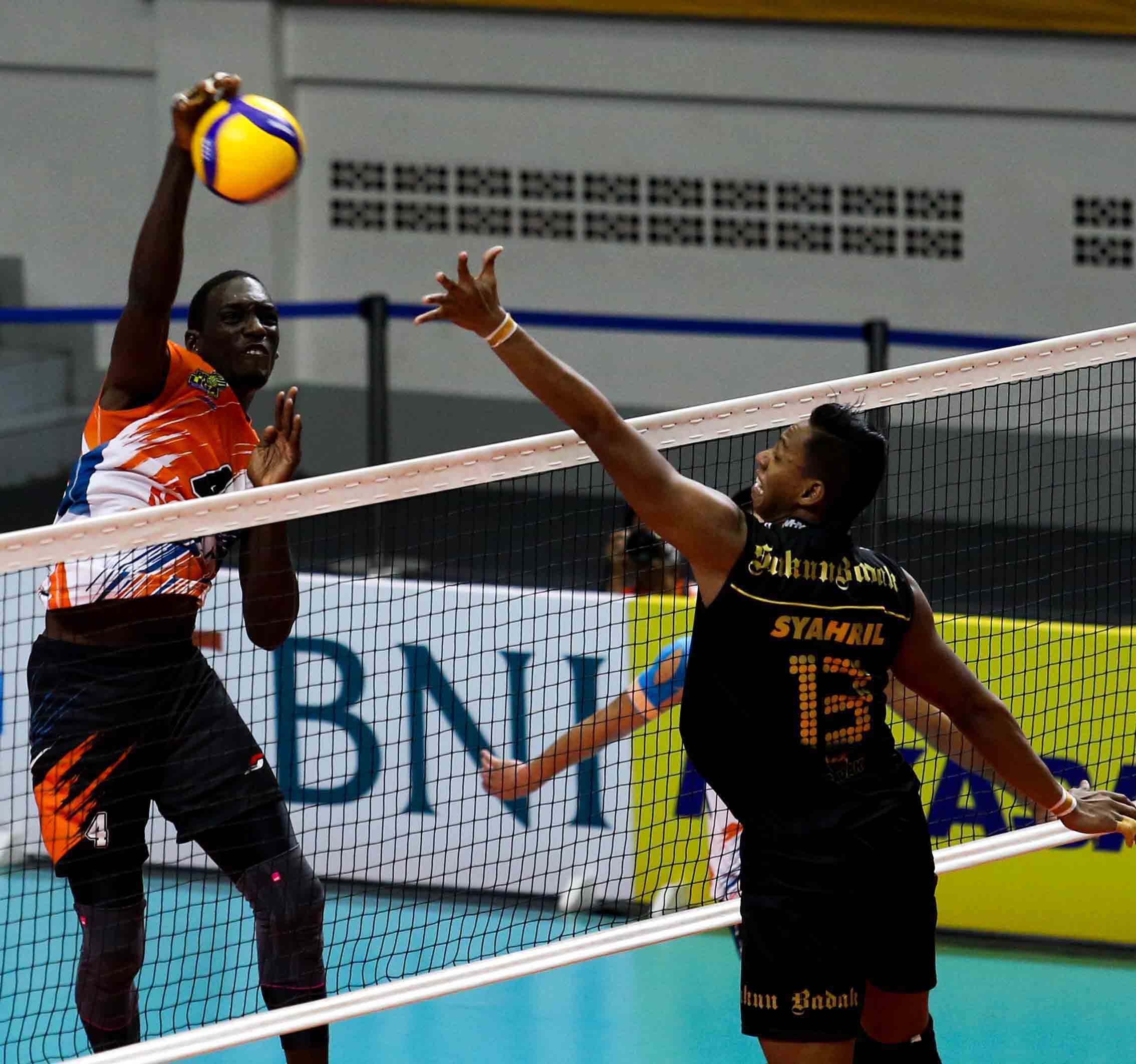 Camejo Durruthy Osmany (4) pemain bola voli Jakarta BNI 46 mengarahkan pukulan smashnya ke area lawan. Jakarta BNI 46 menang atas tim bola voli putra Kudus Sukun Badak dengan skor 3-2 (25-18, 20-25, 25-16, 23-25, 15-12) pada Pertandingan Proliga 2022 putaran pertama yang berlangsung di GOR Padepokan Voli Jenderal Polisi Kunarto, Sentul, Jum’at (28/1/2022). (Foto : Erly Bahtiar/Sportsmoment.id)