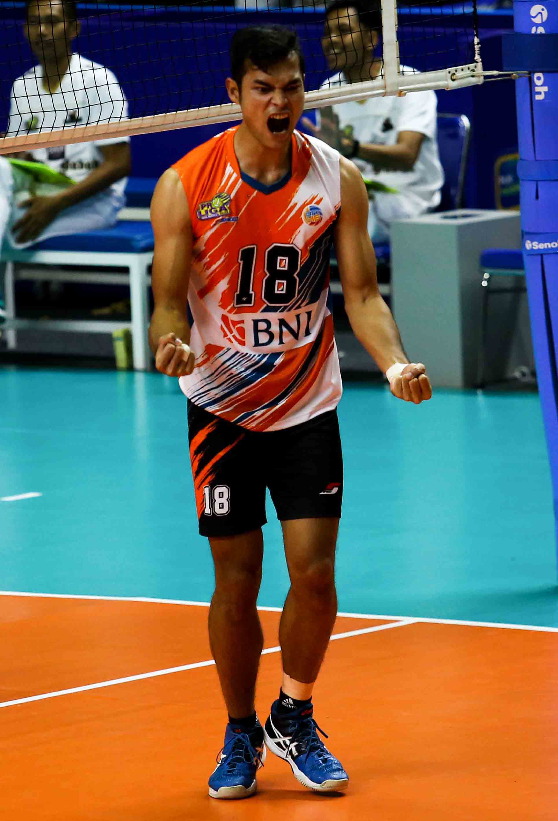 Rian Irawan (18) pemain bola voli Jakarta BNI 46 meluapkan emosi kegembiraan setelah berhasil meraih poin. Jakarta BNI 46 menang atas tim bola voli putra Kudus Sukun Badak dengan skor 3-2 (25-18, 20-25, 25-16, 23-25, 15-12) pada Pertandingan Proliga 2022 putaran pertama yang berlangsung di GOR Padepokan Voli Jenderal Polisi Kunarto, Sentul, Jum’at (28/1/2022). (Foto : Erly Bahtiar/Sportsmoment.id)