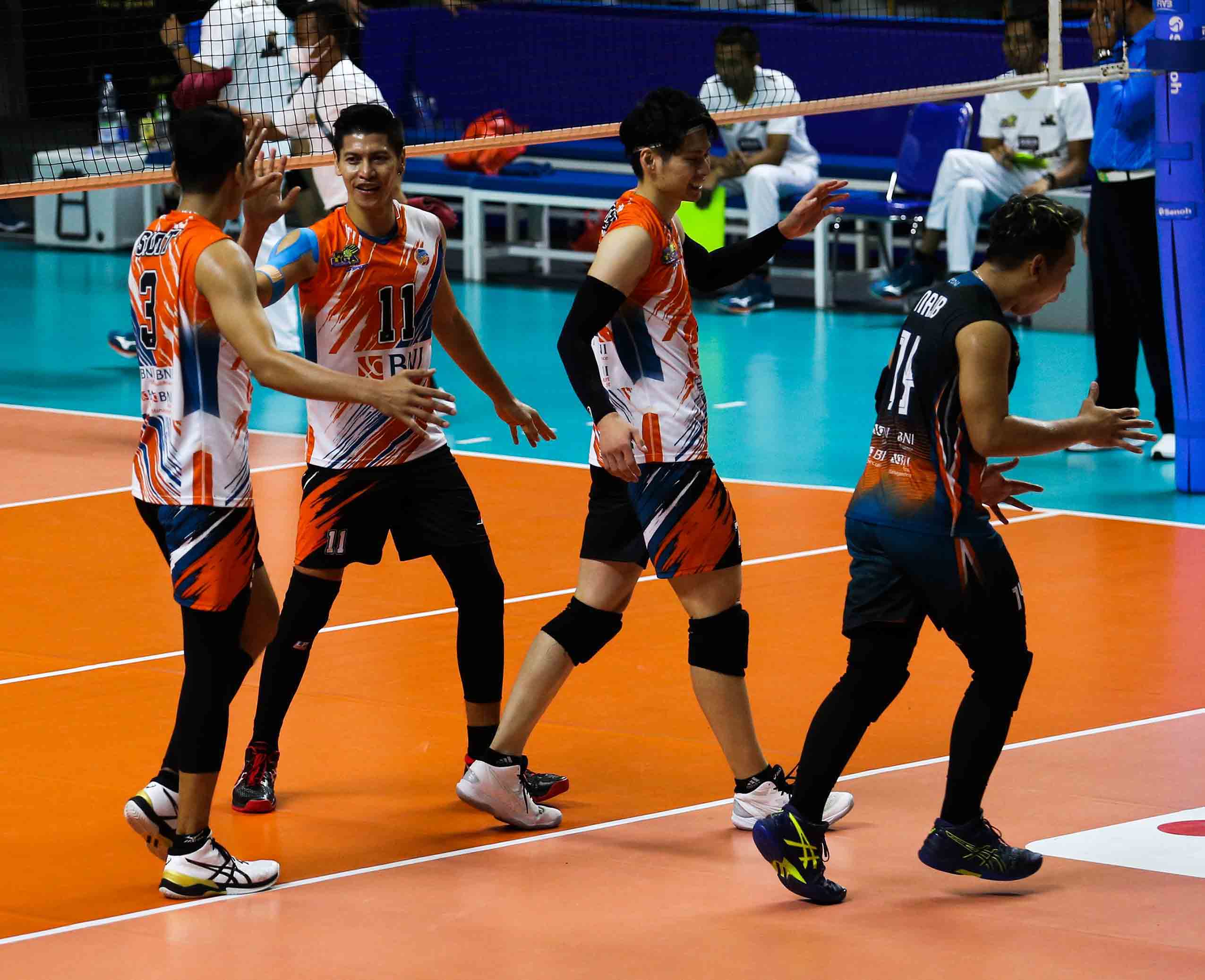Dimas Saputra (11) pemain bola voli Jakarta BNI 46 meluapkan emosi kegembiraan setelah berhasil meraih poin. Jakarta BNI 46 menang atas tim bola voli putra Kudus Sukun Badak dengan skor 3-2 (25-18, 20-25, 25-16, 23-25, 15-12) pada Pertandingan Proliga 2022 putaran pertama yang berlangsung di GOR Padepokan Voli Jenderal Polisi Kunarto, Sentul, Jum’at (28/1/2022). (Foto : Erly Bahtiar/Sportsmoment.id)