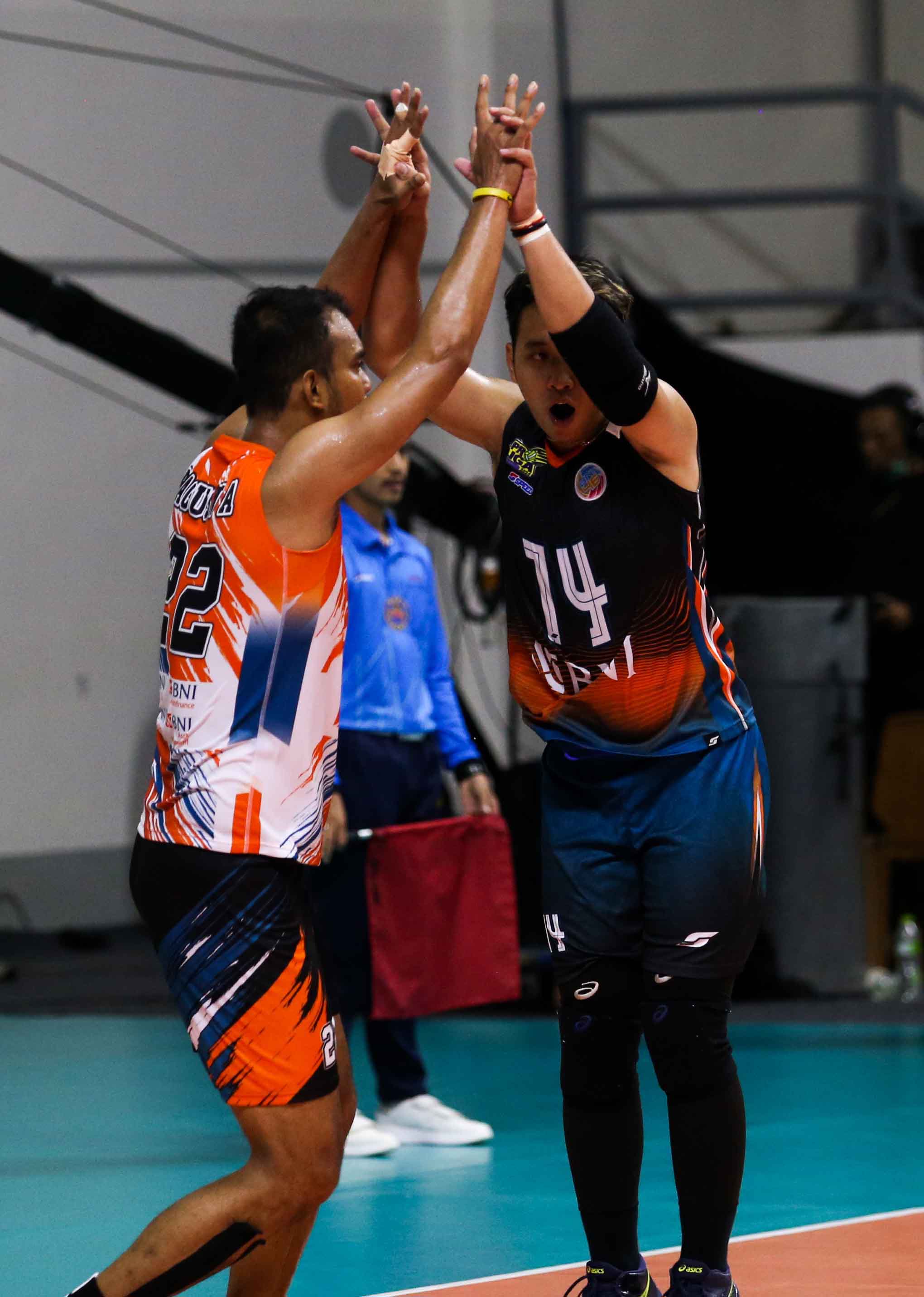 Muhamad Saifudin Najib (14) pemain bola voli Jakarta BNI 46 meluapkan emosi kegembiraan setelah berhasil meraih poin. Jakarta BNI 46 menang atas tim bola voli putra Kudus Sukun Badak dengan skor 3-2 (25-18, 20-25, 25-16, 23-25, 15-12) pada Pertandingan Proliga 2022 putaran pertama yang berlangsung di GOR Padepokan Voli Jenderal Polisi Kunarto, Sentul, Jum’at (28/1/2022). (Foto : Erly Bahtiar/Sportsmoment.id)