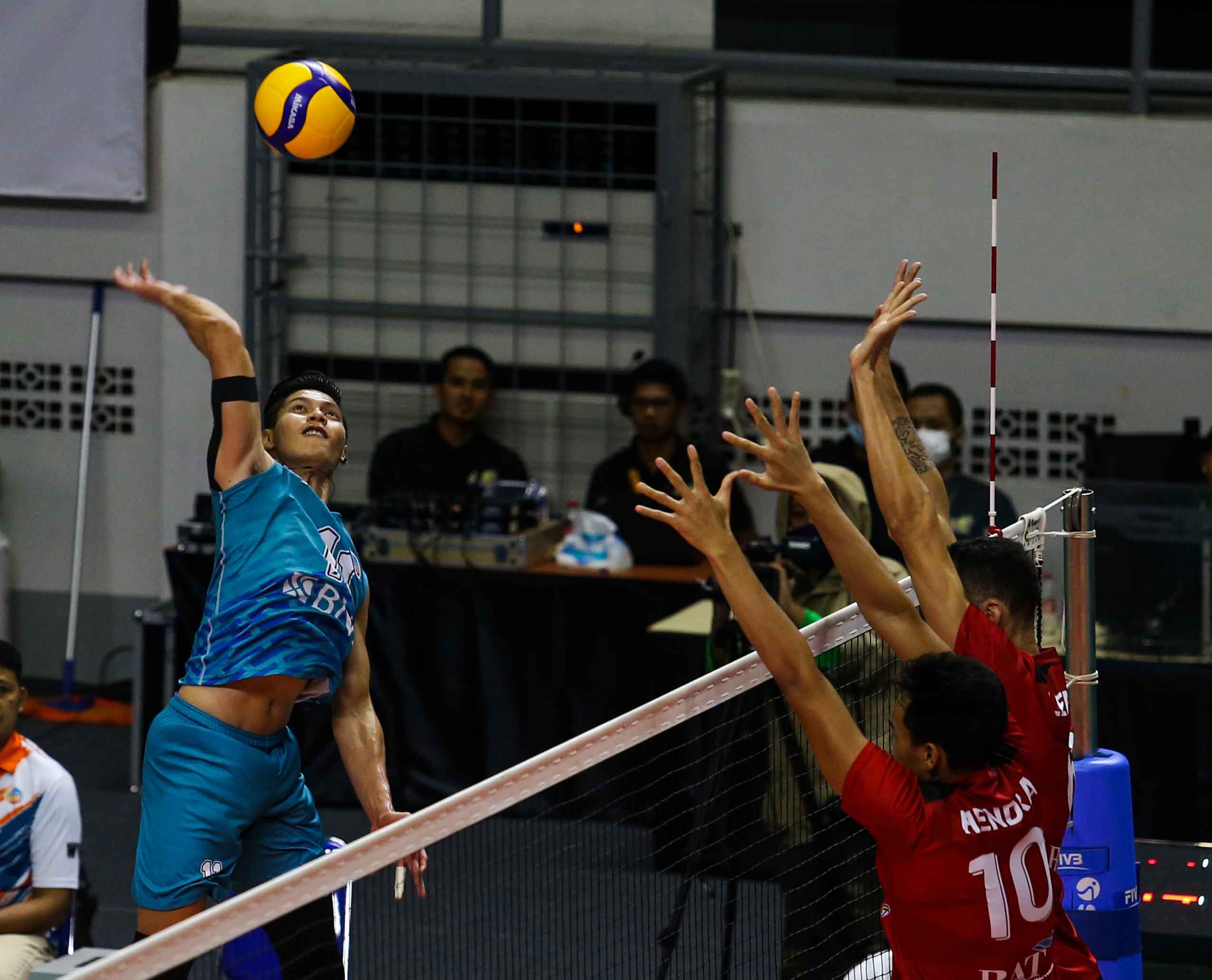 Dimas Saputra (11) pemain bola voli Jakarta BNI 46 mengarahkan pukulan smashnya ke area lawan. Jakarta BNI 46 harus mengakui keunggulan tim bola voli putra Bogor Lavani dengan skor 1-3 (17-25, 25-21, 15-25, 16-25) pada Pertandingan Proliga 2022 putaran pertama yang berlangsung di GOR Padepokan Voli Jenderal Polisi Kunarto, Sentul, Minggu (23/1/2022). (Foto : Erly Bahtiar/Sportsmoment.id)