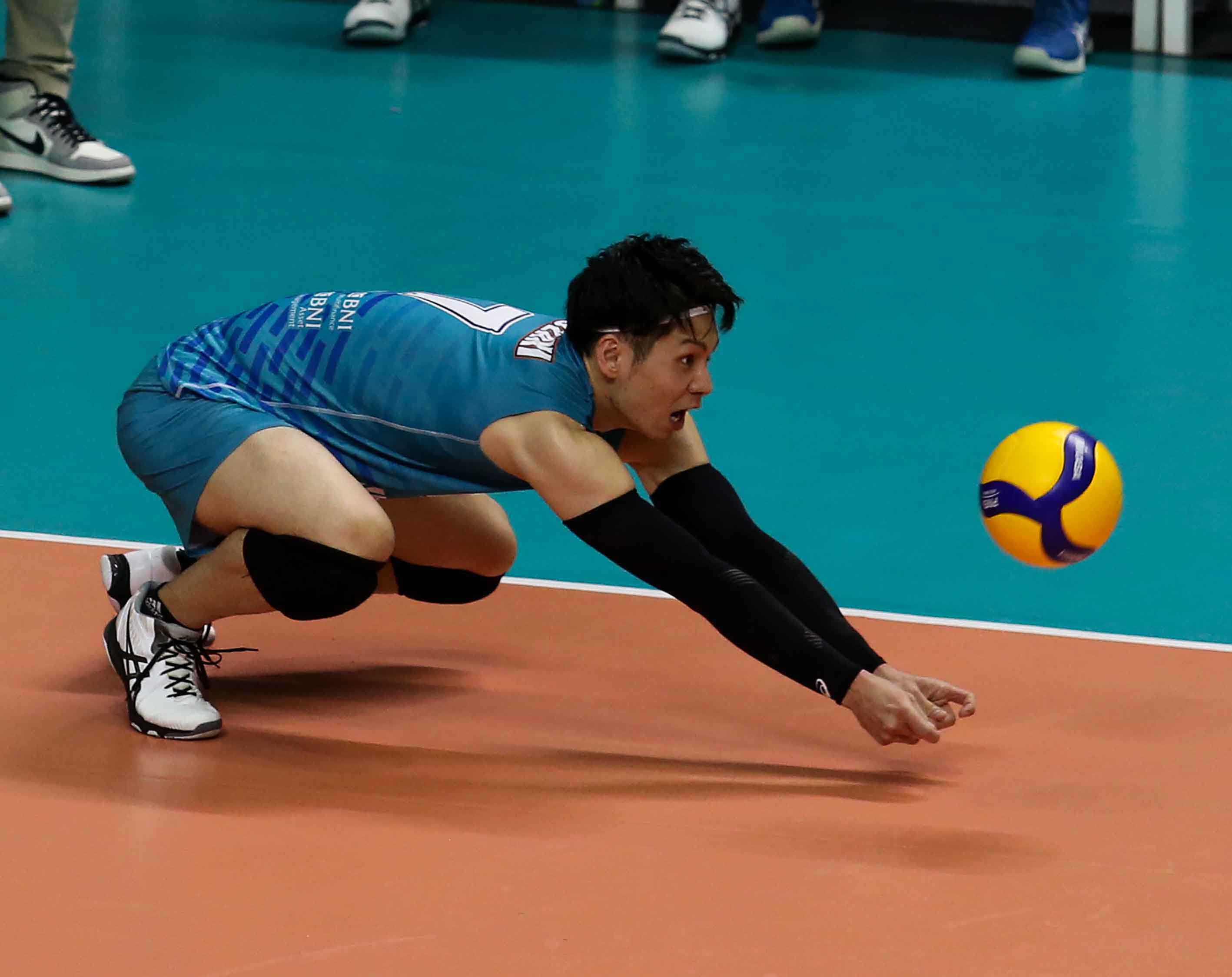 Takahiro Tozaki (7) pemain bola voli Jakarta BNI 46 menerima bola lawan. Jakarta BNI 46 harus mengakui keunggulan tim bola voli putra Bogor Lavani dengan skor 1-3 (17-25, 25-21, 15-25, 16-25) pada Pertandingan Proliga 2022 putaran pertama yang berlangsung di GOR Padepokan Voli Jenderal Polisi Kunarto, Sentul, Minggu (23/1/2022). (Foto : Erly Bahtiar/Sportsmoment.id)
