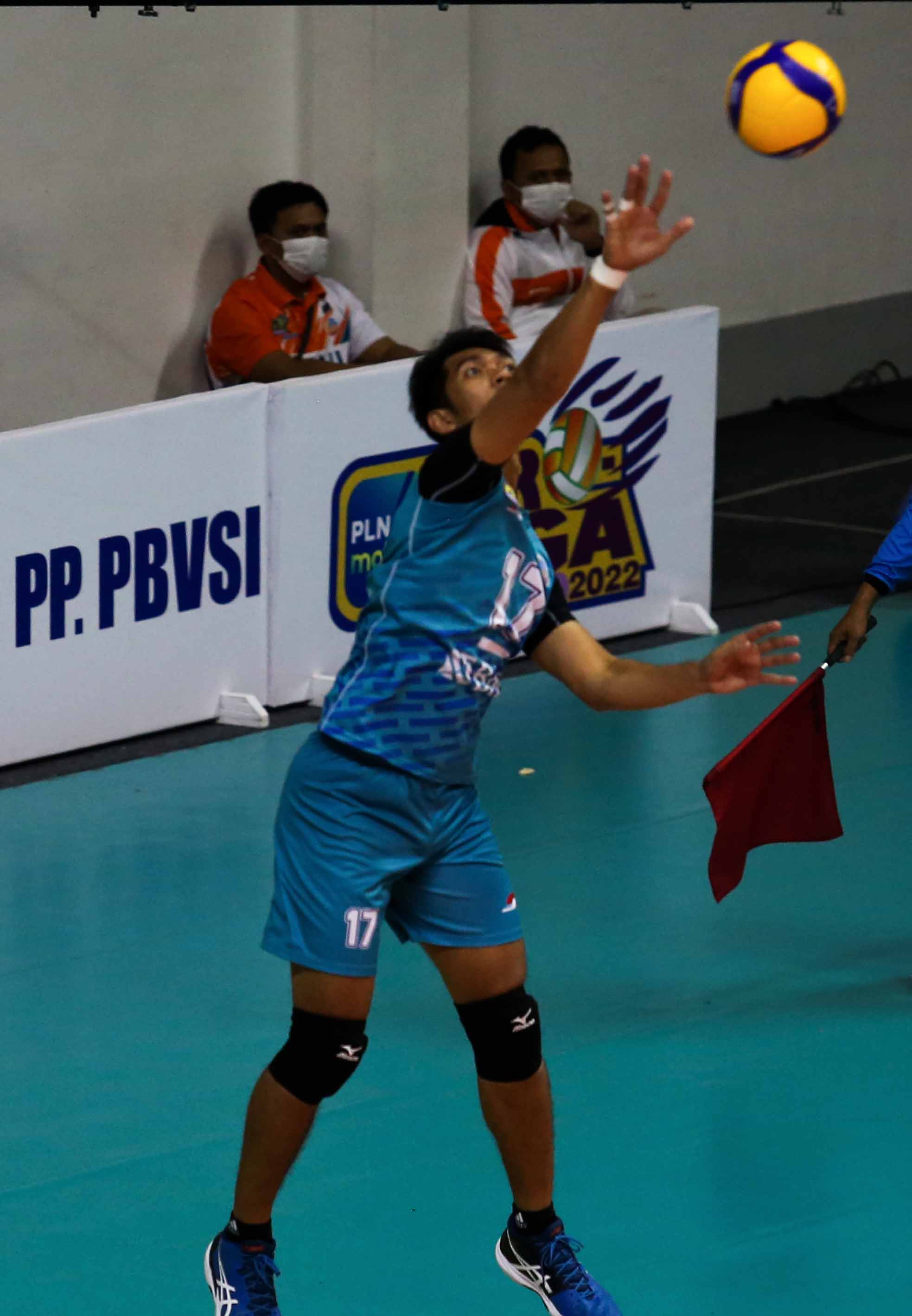 Mahendra Rikha Buana (17) pemain bola voli Jakarta BNI 46 melakukan servis ke area lawan. Jakarta BNI 46 harus mengakui keunggulan tim bola voli putra Bogor Lavani dengan skor 1-3 (17-25, 25-21, 15-25, 16-25) pada Pertandingan Proliga 2022 putaran pertama yang berlangsung di GOR Padepokan Voli Jenderal Polisi Kunarto, Sentul, Minggu (23/1/2022). (Foto : Erly Bahtiar/Sportsmoment.id)