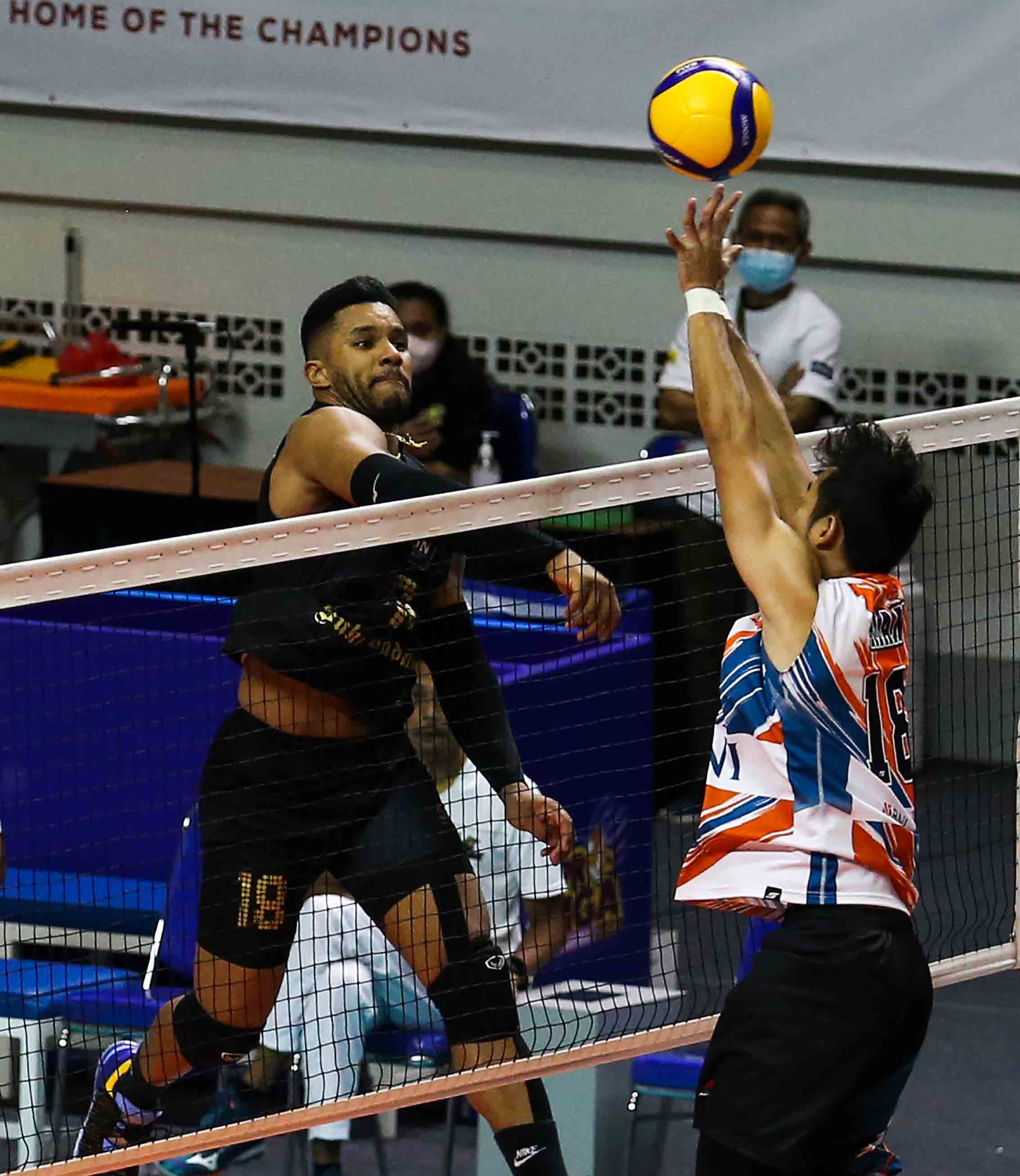 De Farias Bueno Douglas (18) pemain bola voli Kudus Sukun Badak mengarahkan pukulan smashnya ke area lawan. Kudus Sukun Badak harus mengakui keunggulan tim bola voli putra Jakarta BNI 46 dengan skor 2-3 (18-25, 25-20, 16-25, 25-23, 12-15) pada Pertandingan Proliga 2022 putaran pertama yang berlangsung di GOR Padepokan Voli Jenderal Polisi Kunarto, Sentul, Jum’at (28/1/2022). (Foto : Erly Bahtiar/Sportsmoment.id)