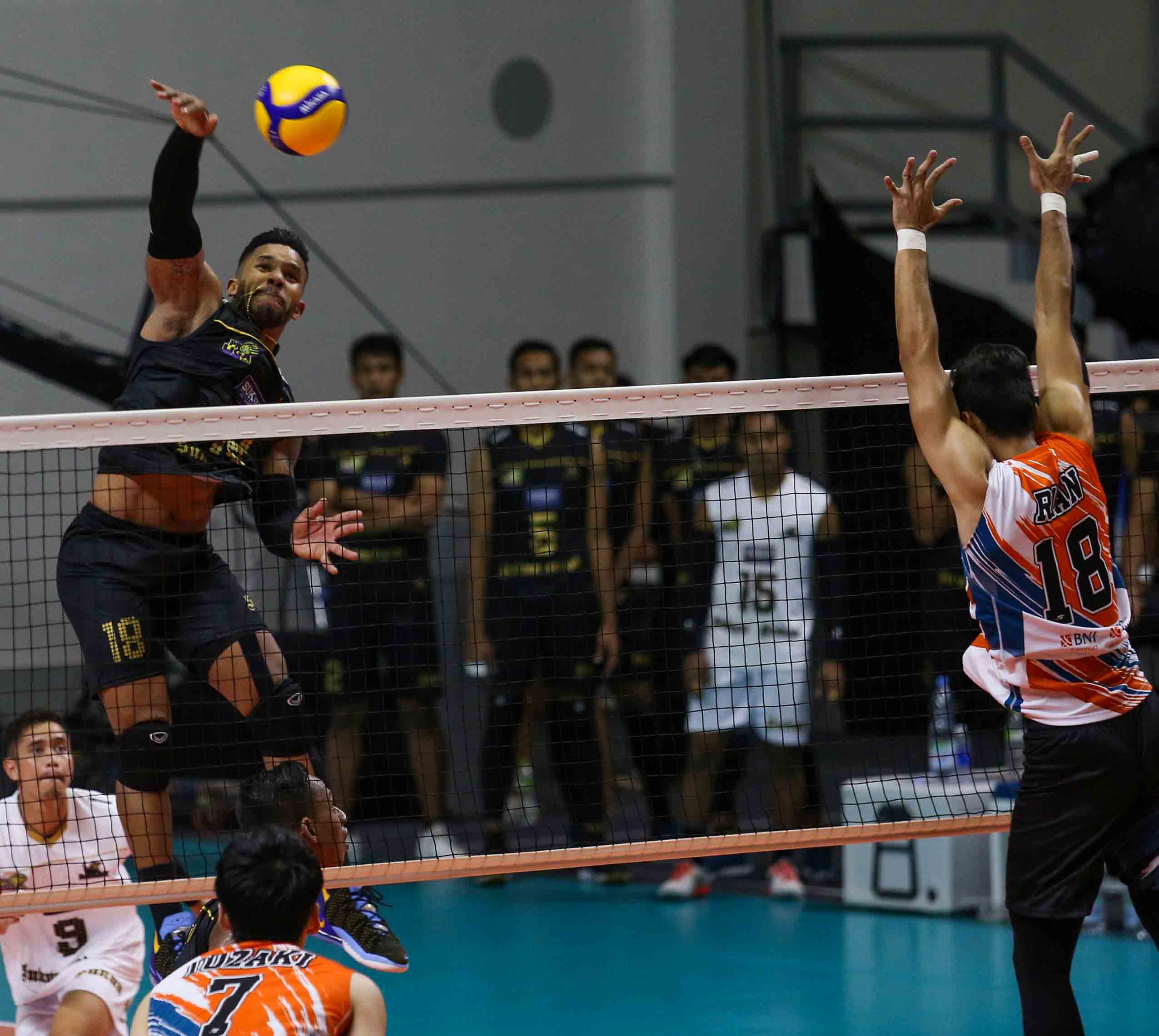 De Farias Bueno Douglas (18) pemain bola voli Kudus Sukun Badak mengarahkan pukulan smashnya ke area lawan. Kudus Sukun Badak harus mengakui keunggulan tim bola voli putra Jakarta BNI 46 dengan skor 2-3 (18-25, 25-20, 16-25, 25-23, 12-15) pada Pertandingan Proliga 2022 putaran pertama yang berlangsung di GOR Padepokan Voli Jenderal Polisi Kunarto, Sentul, Jum’at (28/1/2022). (Foto : Erly Bahtiar/Sportsmoment.id)