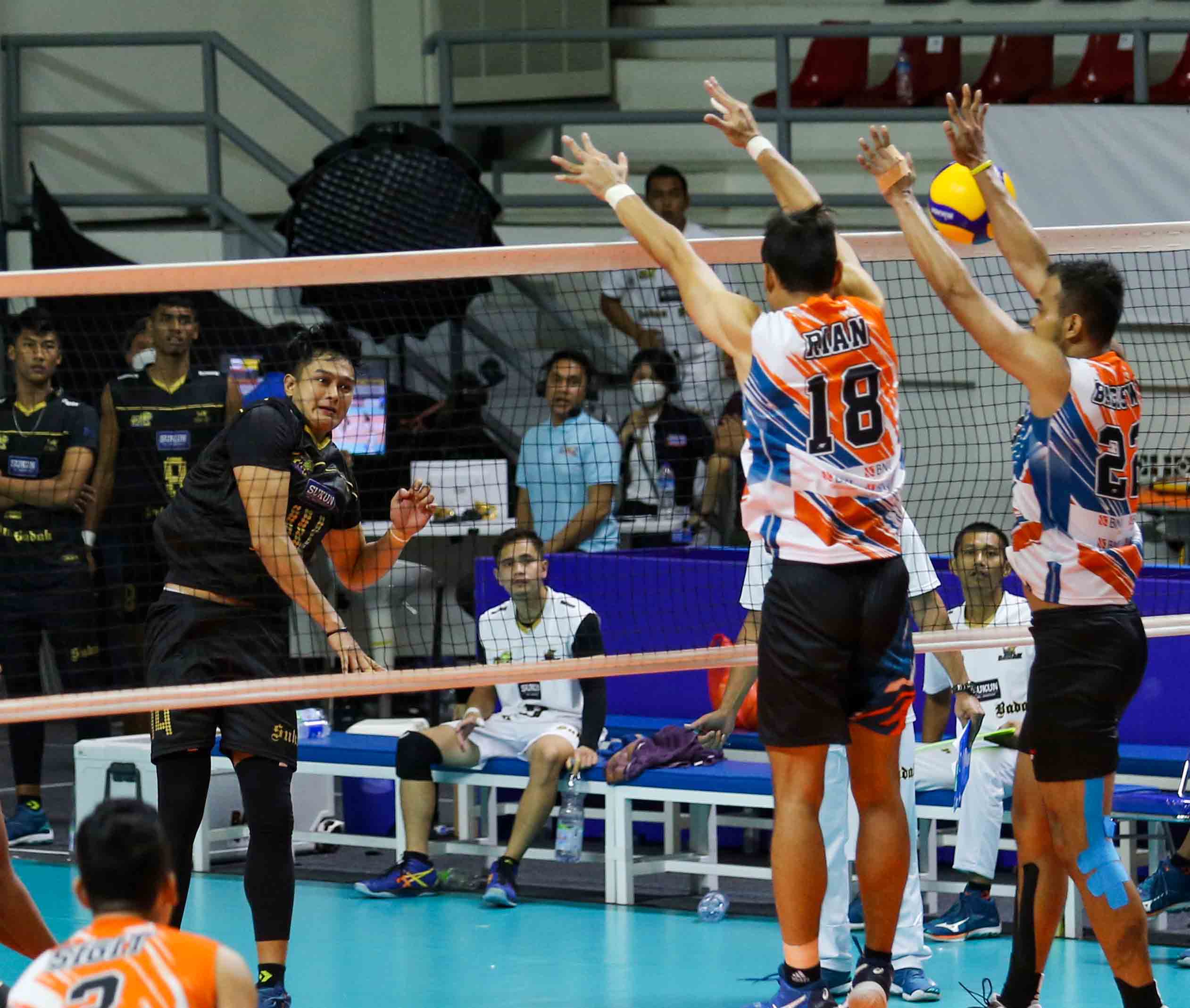 Ryno Viagustama (14) pemain bola voli Kudus Sukun Badak mengarahkan pukulan smashnya ke area lawan. Kudus Sukun Badak harus mengakui keunggulan tim bola voli putra Jakarta BNI 46 dengan skor 2-3 (18-25, 25-20, 16-25, 25-23, 12-15) pada Pertandingan Proliga 2022 putaran pertama yang berlangsung di GOR Padepokan Voli Jenderal Polisi Kunarto, Sentul, Jum’at (28/1/2022). (Foto : Erly Bahtiar/Sportsmoment.id)