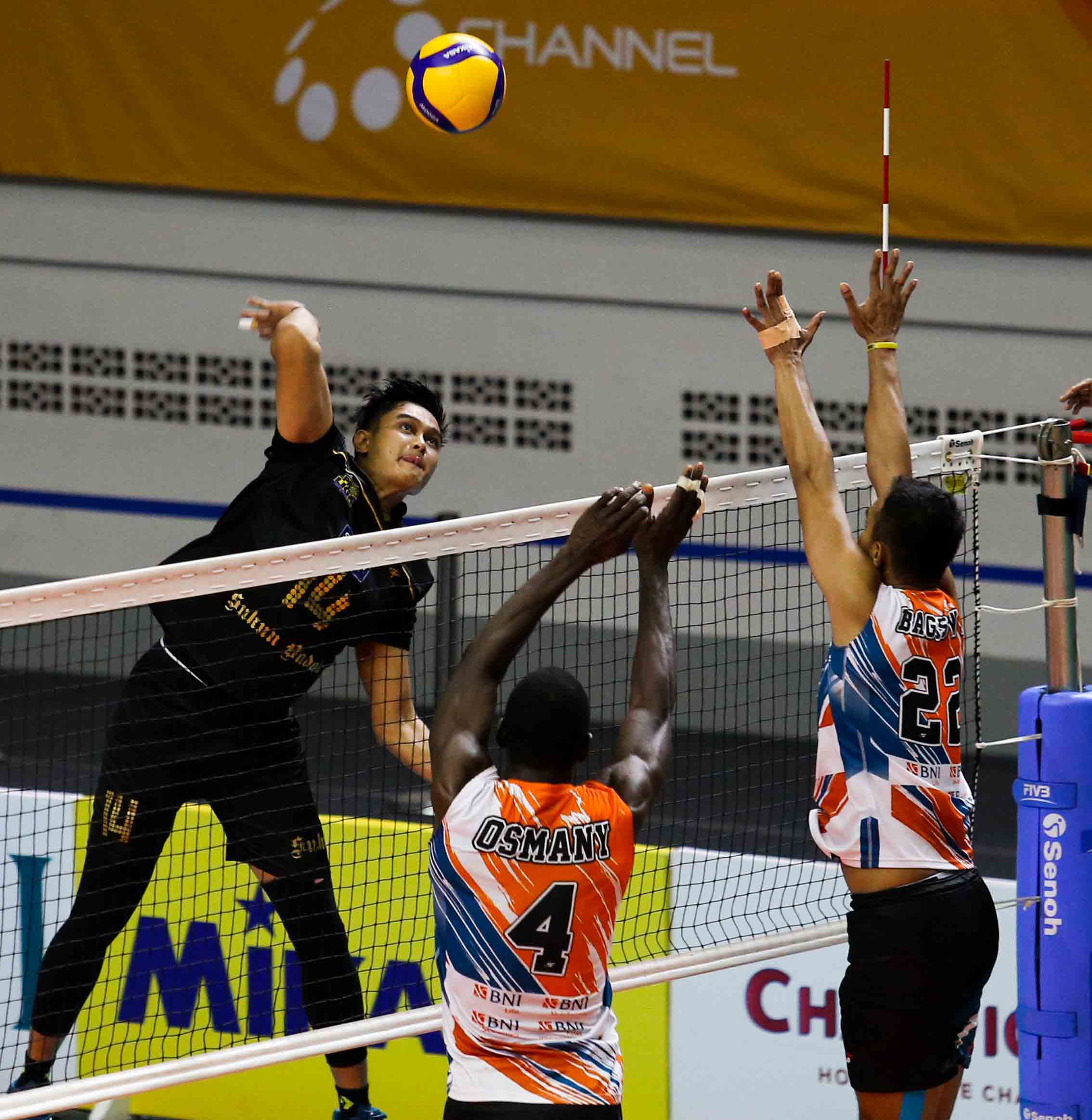 Ryno Viagustama (14) pemain bola voli Kudus Sukun Badak mengarahkan pukulan smashnya ke area lawan. Kudus Sukun Badak harus mengakui keunggulan tim bola voli putra Jakarta BNI 46 dengan skor 2-3 (18-25, 25-20, 16-25, 25-23, 12-15) pada Pertandingan Proliga 2022 putaran pertama yang berlangsung di GOR Padepokan Voli Jenderal Polisi Kunarto, Sentul, Jum’at (28/1/2022). (Foto : Erly Bahtiar/Sportsmoment.id)