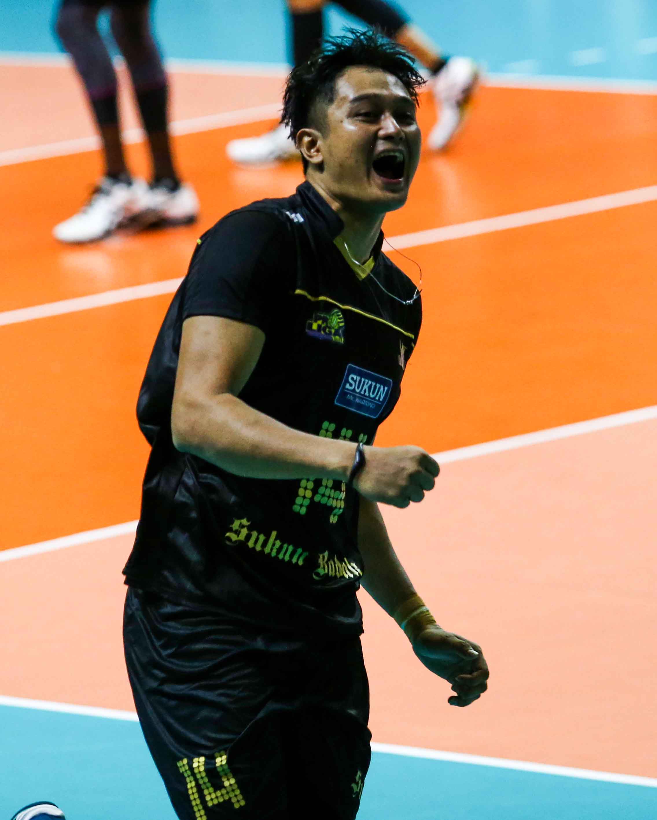 Ryno Viagustama (14) pemain bola voli Kudus Sukun Badak meluapkan emosi kegembiraan setelah berhasil meraih poin. Kudus Sukun Badak harus mengakui keunggulan tim bola voli putra Jakarta BNI 46 dengan skor 2-3 (18-25, 25-20, 16-25, 25-23, 12-15) pada Pertandingan Proliga 2022 putaran pertama yang berlangsung di GOR Padepokan Voli Jenderal Polisi Kunarto, Sentul, Jum’at (28/1/2022). (Foto : Erly Bahtiar/Sportsmoment.id),