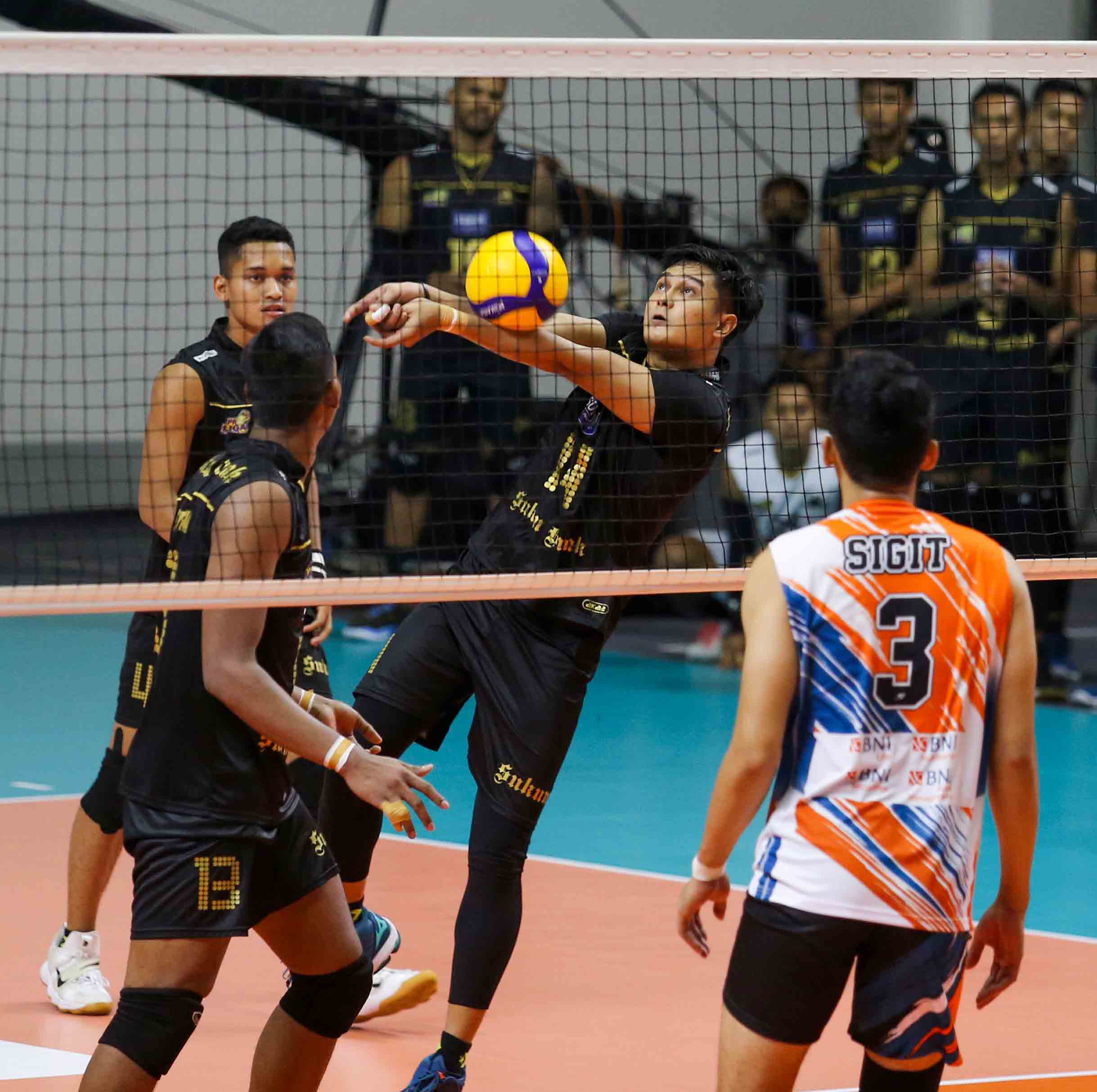 Ryno Viagustama (14) pemain bola voli Kudus Sukun Badak menerima bola lawan. Kudus Sukun Badak harus mengakui keunggulan tim bola voli putra Jakarta BNI 46 dengan skor 2-3 (18-25, 25-20, 16-25, 25-23, 12-15) pada Pertandingan Proliga 2022 putaran pertama yang berlangsung di GOR Padepokan Voli Jenderal Polisi Kunarto, Sentul, Jum’at (28/1/2022). (Foto : Erly Bahtiar/Sportsmoment.id),