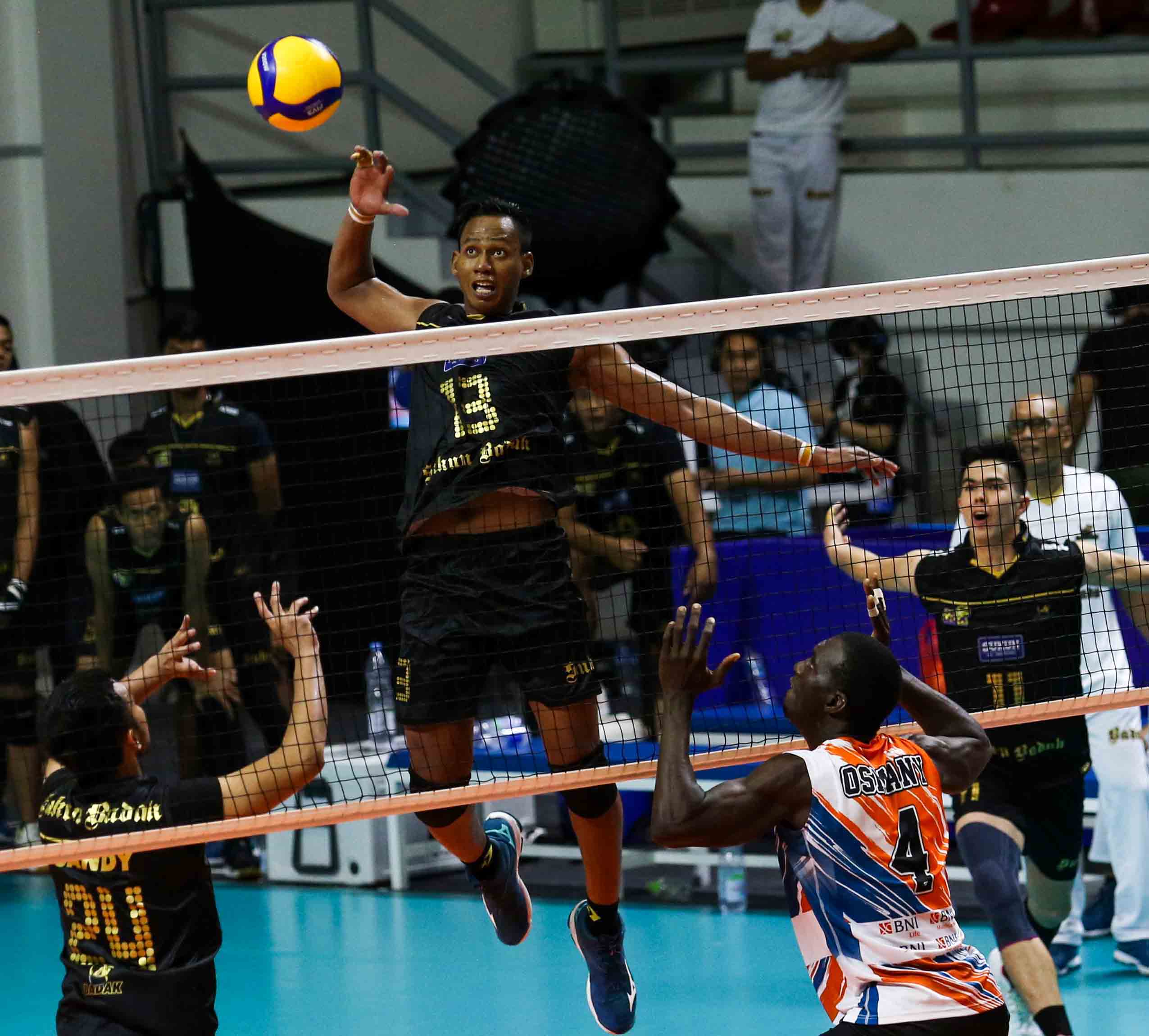 Moch. Syahril Amri (13) pemain bola voli Kudus Sukun Badak mengarahkan pukulan smashnya ke area lawan. Kudus Sukun Badak harus mengakui keunggulan tim bola voli putra Jakarta BNI 46 dengan skor 2-3 (18-25, 25-20, 16-25, 25-23, 12-15) pada Pertandingan Proliga 2022 putaran pertama yang berlangsung di GOR Padepokan Voli Jenderal Polisi Kunarto, Sentul, Jum’at (28/1/2022). (Foto : Erly Bahtiar/Sportsmoment.id)