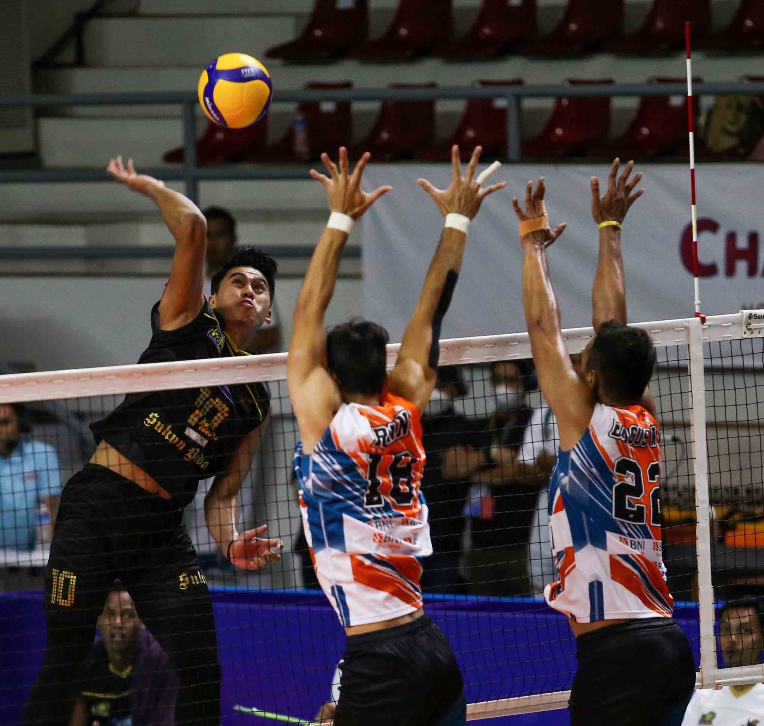 Fahri Septian Putratama (10) pemain bola voli Kudus Sukun Badak mengarahkan pukulan smashnya ke area lawan. Kudus Sukun Badak harus mengakui keunggulan tim bola voli putra Jakarta BNI 46 dengan skor 2-3 (18-25, 25-20, 16-25, 25-23, 12-15) pada Pertandingan Proliga 2022 putaran pertama yang berlangsung di GOR Padepokan Voli Jenderal Polisi Kunarto, Sentul, Jum’at (28/1/2022). (Foto : Erly Bahtiar/Sportsmoment.id)