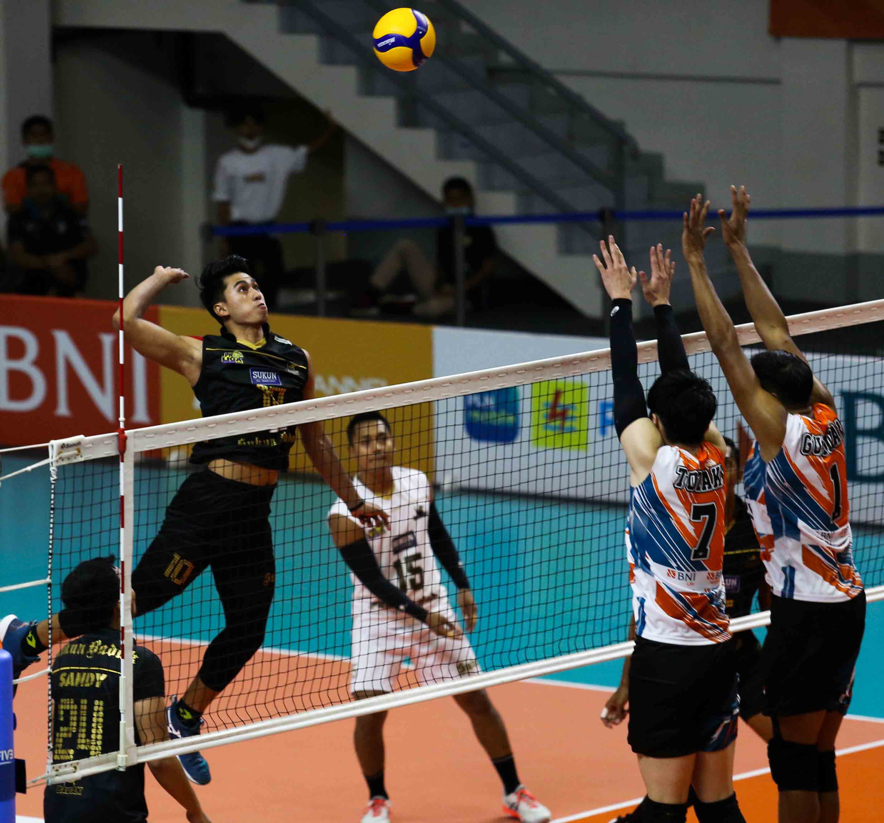 Fahri Septian Putratama (10) pemain bola voli Kudus Sukun Badak mengarahkan pukulan smashnya ke area lawan. Kudus Sukun Badak harus mengakui keunggulan tim bola voli putra Jakarta BNI 46 dengan skor 2-3 (18-25, 25-20, 16-25, 25-23, 12-15) pada Pertandingan Proliga 2022 putaran pertama yang berlangsung di GOR Padepokan Voli Jenderal Polisi Kunarto, Sentul, Jum’at (28/1/2022). (Foto : Erly Bahtiar/Sportsmoment.id)