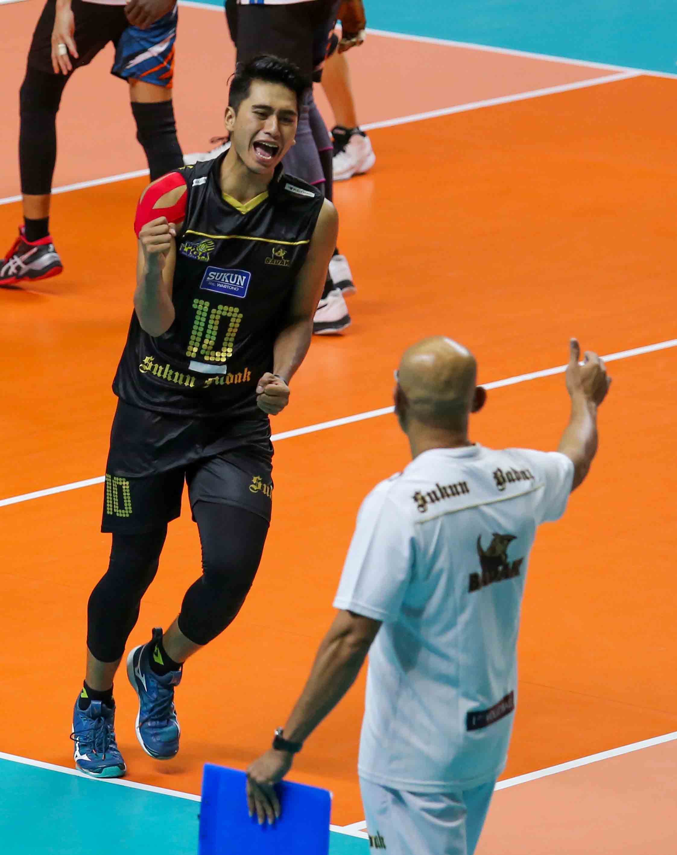 Fahri Septian Putratama (10) pemain bola voli Kudus Sukun Badak meluapkan emosi kegembiraan setelah berhasil merih poin. Kudus Sukun Badak harus mengakui keunggulan tim bola voli putra Jakarta BNI 46 dengan skor 2-3 (18-25, 25-20, 16-25, 25-23, 12-15) pada Pertandingan Proliga 2022 putaran pertama yang berlangsung di GOR Padepokan Voli Jenderal Polisi Kunarto, Sentul, Jum’at (28/1/2022). (Foto : Erly Bahtiar/Sportsmoment.id)
