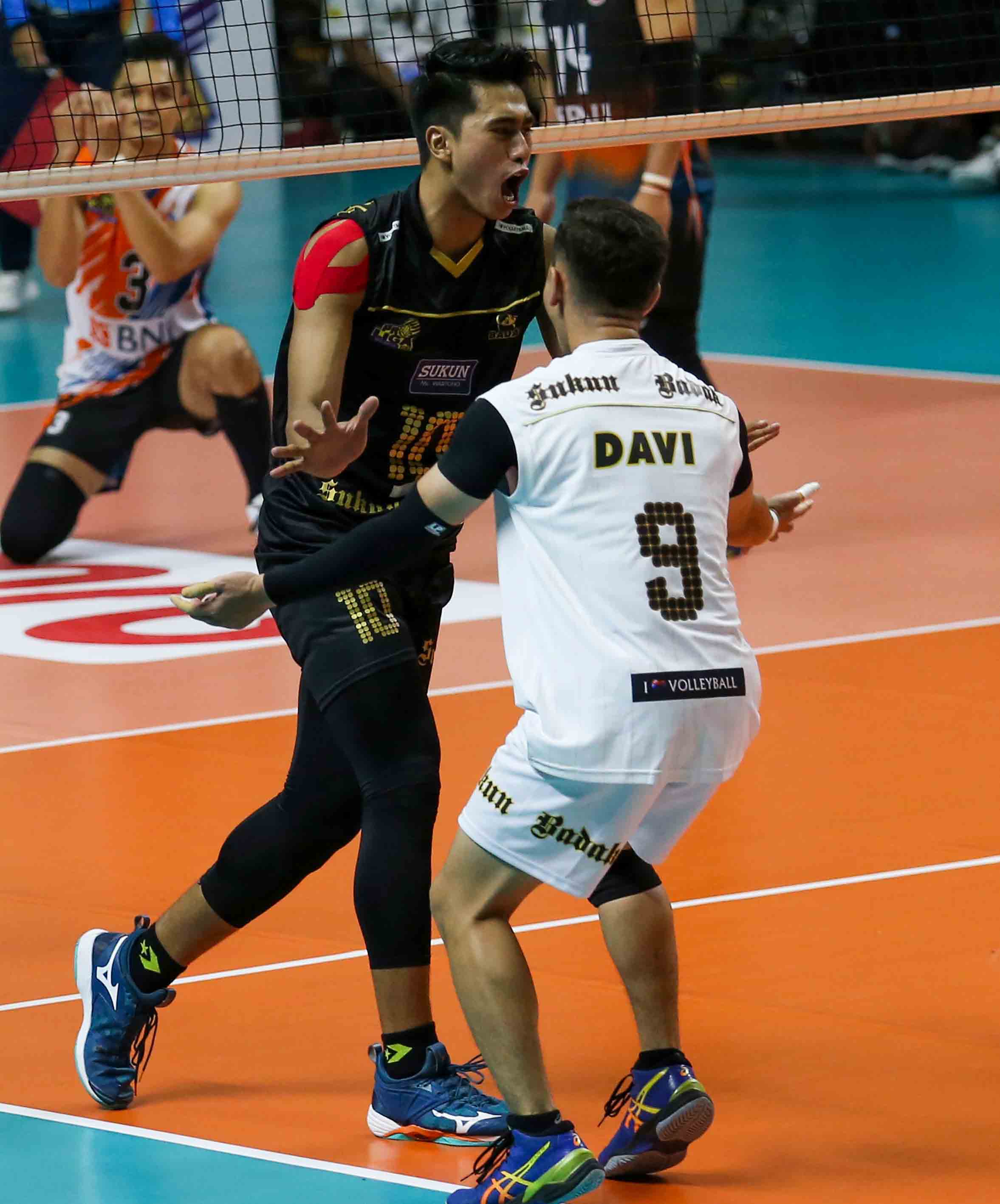Fahri Septian Putratama (10) pemain bola voli Kudus Sukun Badak meluapkan emosi kegembiraan setelah berhasil merih poin. Kudus Sukun Badak harus mengakui keunggulan tim bola voli putra Jakarta BNI 46 dengan skor 2-3 (18-25, 25-20, 16-25, 25-23, 12-15) pada Pertandingan Proliga 2022 putaran pertama yang berlangsung di GOR Padepokan Voli Jenderal Polisi Kunarto, Sentul, Jum’at (28/1/2022). (Foto : Erly Bahtiar/Sportsmoment.id)