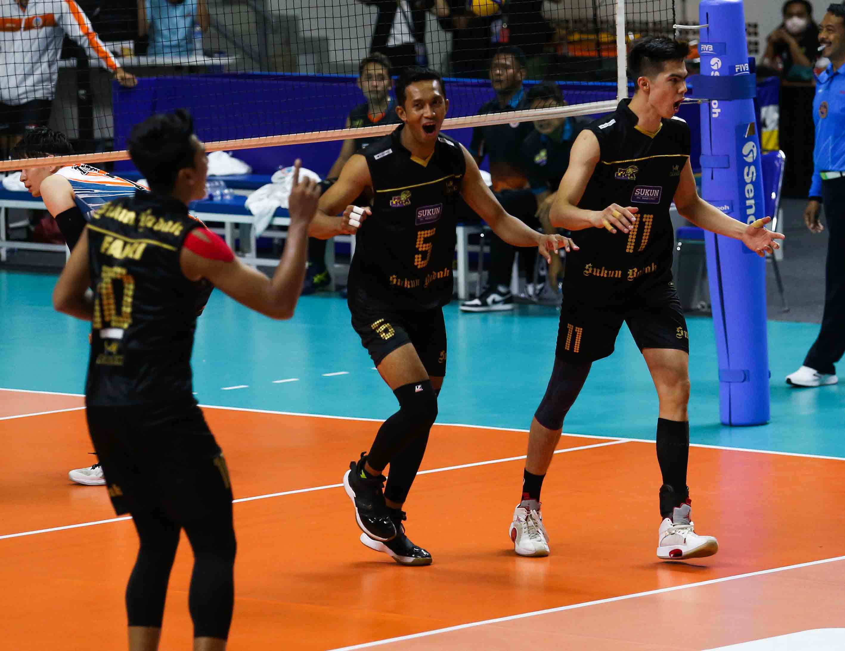Antho Bertiyawan (5) pemain bola voli Kudus Sukun Badak meluapkan emosi kegembiraan setelah berhasil merih poin. Kudus Sukun Badak harus mengakui keunggulan tim bola voli putra Jakarta BNI 46 dengan skor 2-3 (18-25, 25-20, 16-25, 25-23, 12-15) pada Pertandingan Proliga 2022 putaran pertama yang berlangsung di GOR Padepokan Voli Jenderal Polisi Kunarto, Sentul, Jum’at (28/1/2022). (Foto : Erly Bahtiar/Sportsmoment.id),