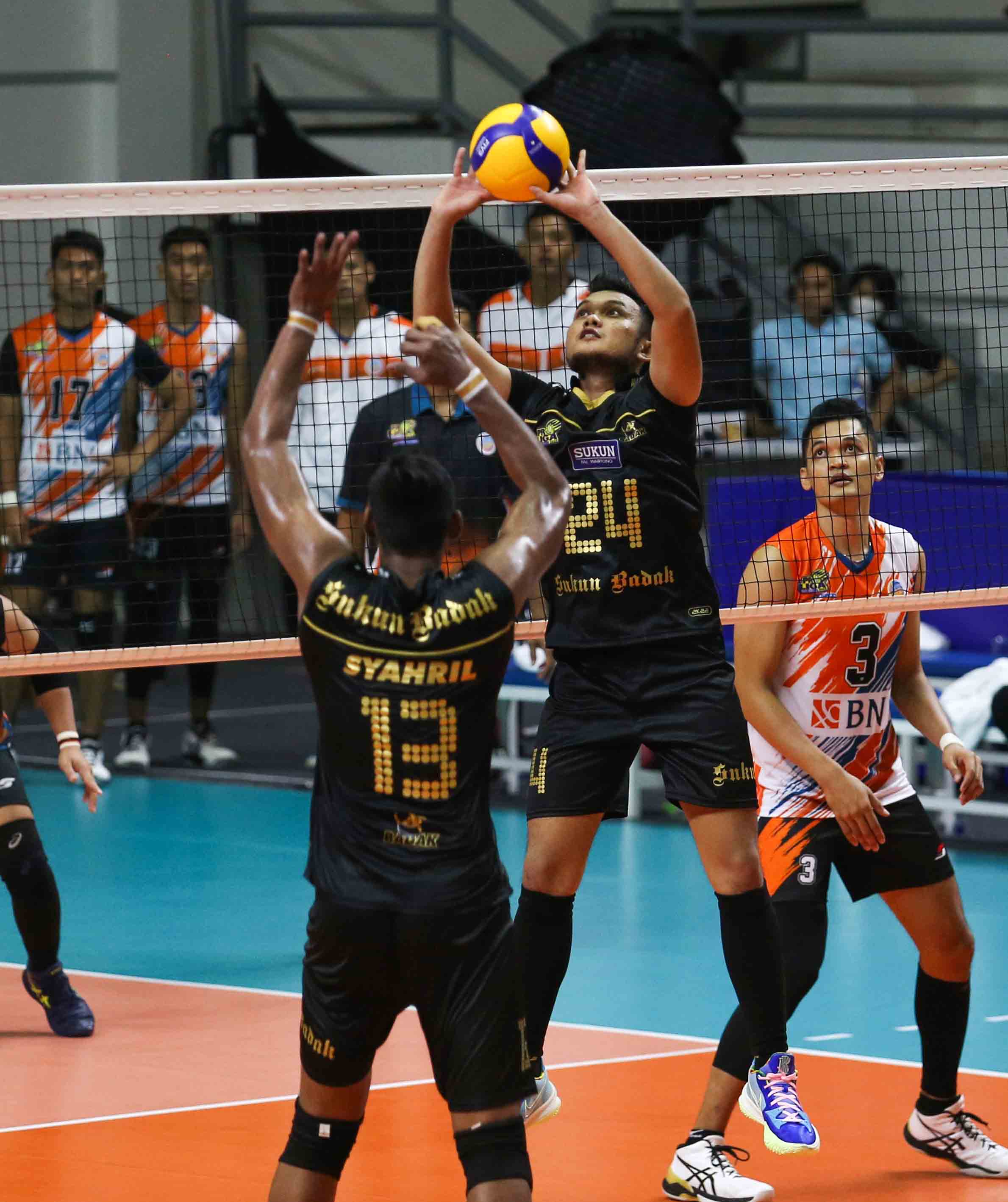 Sandy Bagas Prasetyo (24) pemain bola voli Kudus Sukun Badak memberikan umpan bola kepada rekannya. Kudus Sukun Badak harus mengakui keunggulan tim bola voli putra Jakarta BNI 46 dengan skor 2-3 (18-25, 25-20, 16-25, 25-23, 12-15) pada Pertandingan Proliga 2022 putaran pertama yang berlangsung di GOR Padepokan Voli Jenderal Polisi Kunarto, Sentul, Jum’at (28/1/2022). (Foto : Erly Bahtiar/Sportsmoment.id)