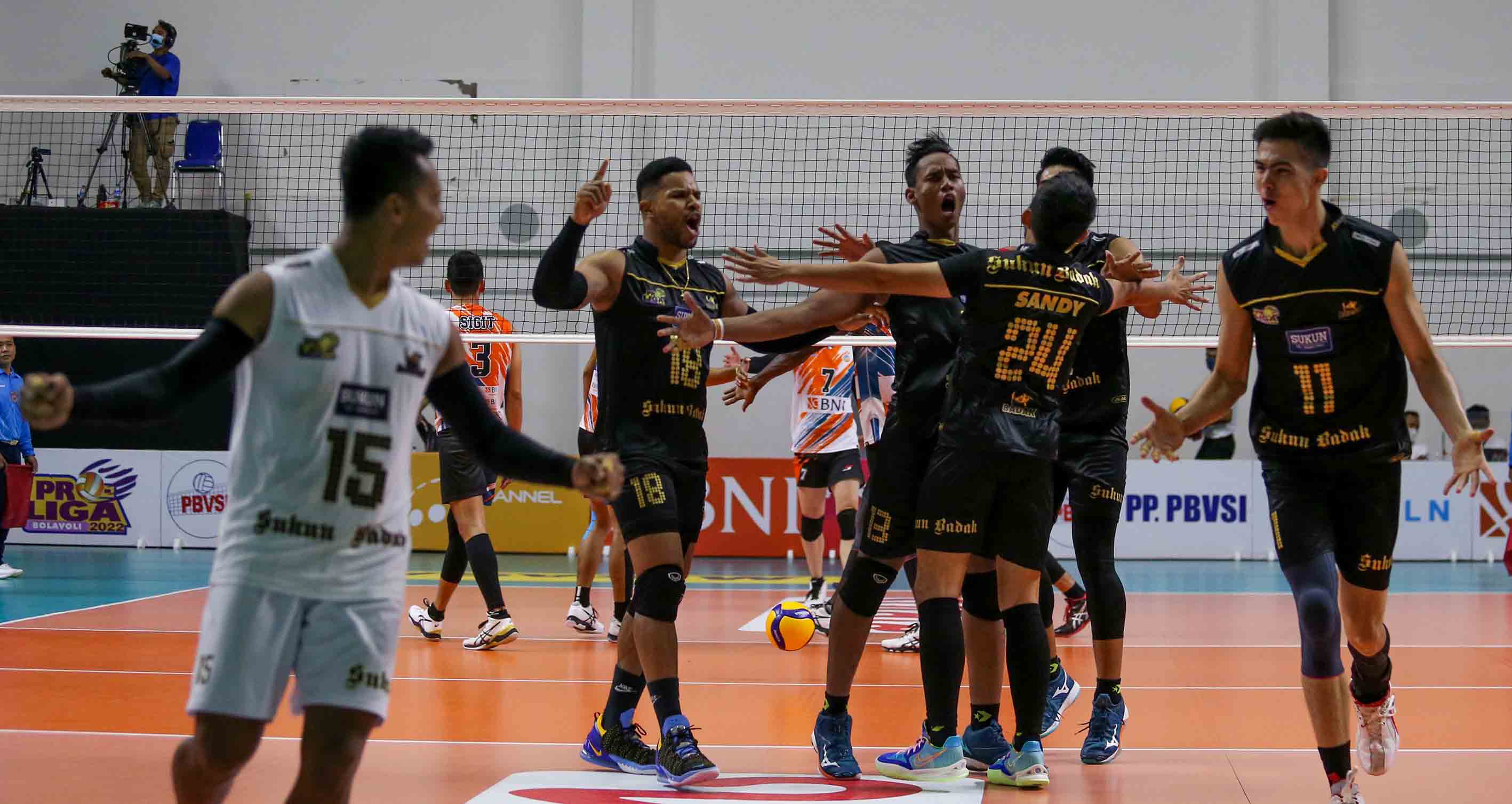 Pemain bola voli putra Kudus Sukun Badak meluapkan emosi kegembiraan setelah berhasil meraih poin. Kudus Sukun Badak harus mengakui keunggulan tim bola voli putra Jakarta BNI 46 dengan skor 2-3 (18-25, 25-20, 16-25, 25-23, 12-15) pada Pertandingan Proliga 2022 putaran pertama yang berlangsung di GOR Padepokan Voli Jenderal Polisi Kunarto, Sentul, Jum’at (28/1/2022). (Foto : Erly Bahtiar/Sportsmoment.id)