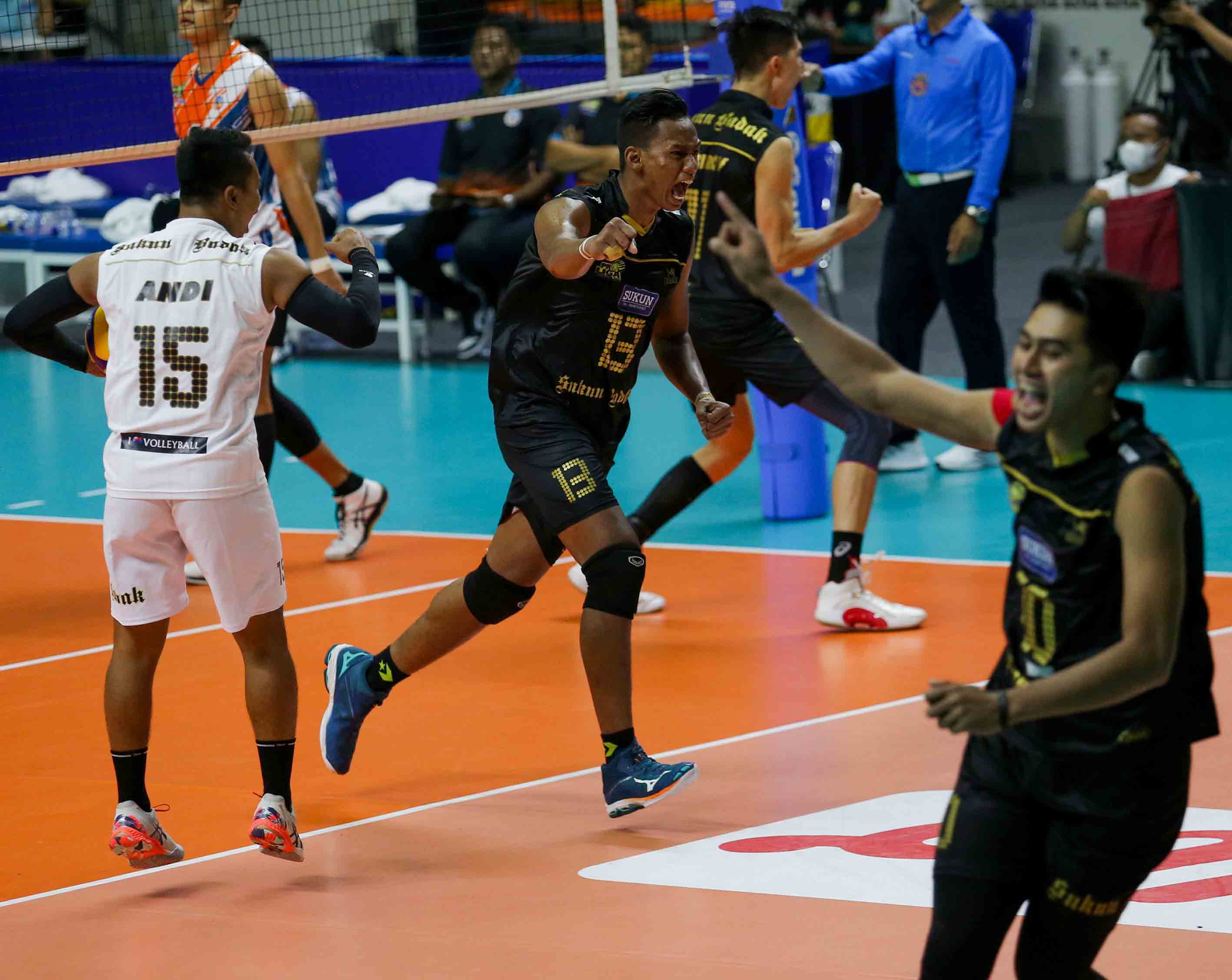 Pemain bola voli putra Kudus Sukun Badak meluapkan emosi kegembiraan setelah berhasil meraih poin. Kudus Sukun Badak harus mengakui keunggulan tim bola voli putra Jakarta BNI 46 dengan skor 2-3 (18-25, 25-20, 16-25, 25-23, 12-15) pada Pertandingan Proliga 2022 putaran pertama yang berlangsung di GOR Padepokan Voli Jenderal Polisi Kunarto, Sentul, Jum’at (28/1/2022). (Foto : Erly Bahtiar/Sportsmoment.id)