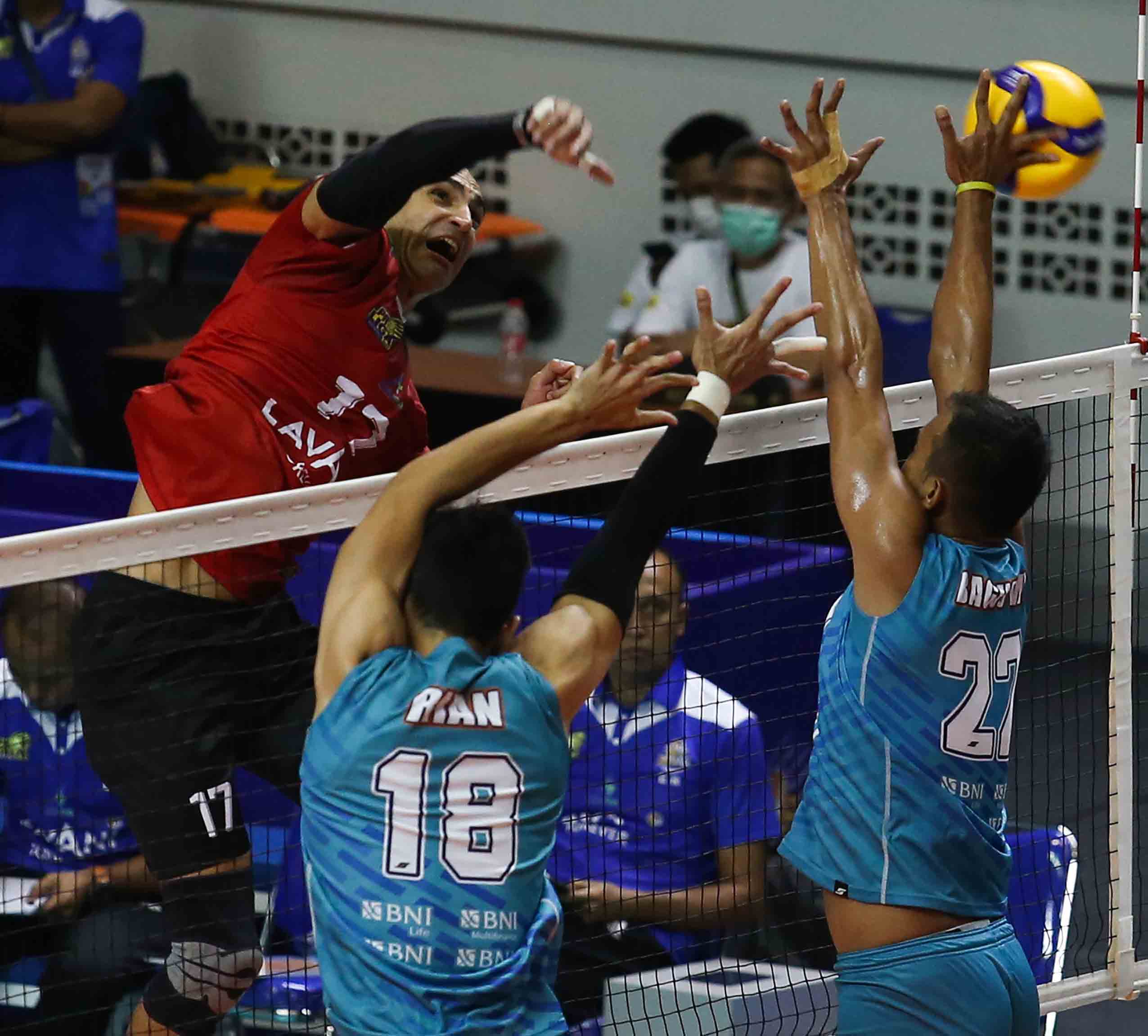 Jorge Gonzales Garcia (17) pemain bola voli Bogor Lavani mengarahkan pukulan smashnya ke area lawan. Bogor Lavani berhasil menang dari tim bola voli putra Jakarta BNI 46 dengan skor 3-1 (25-17, 21-25, 25-15, 25-16) pada Pertandingan Proliga 2022 putaran pertama yang berlangsung di GOR Padepokan Voli Jenderal Polisi Kunarto, Sentul, Minggu (23/1/2022). (Foto : Erly Bahtiar/Sportsmoment.id)
